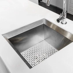De beschermmat voor de gootsteen is een eenvoudige en effectieve manier om de levensduur van uw keukengootsteen te verlengen. Dankzij het geperforeerde design kan water vrij weglopen en hoopt het zich niet op de bodem op, terwijl het zachte maar stevige materiaal schokken van servies dempt en het oppervlak van de gootsteen beschermt.