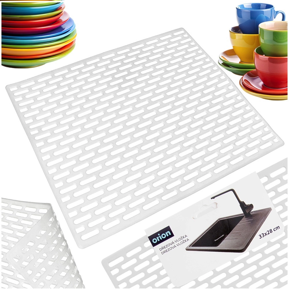 Praktische gootsteenmat met afmetingen 33 × 28 cm beschermt de bodem van de gootsteen doeltreffend tegen krassen en deuken. Gemaakt van duurzaam thermoplastisch materiaal, met een antislip oppervlak, perforaties voor vrije waterafvoer en dankzij de vochtbestendigheid ideaal voor dagelijks gebruik in de keuken.