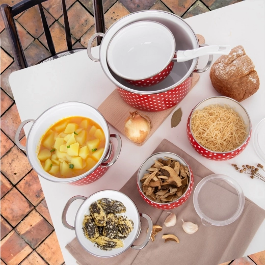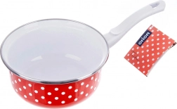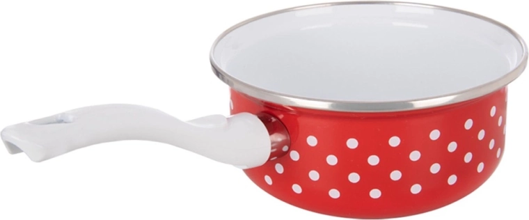 Elegant steelpannetje in retrodesign met rode emaille en witte stippen siert je keuken en biedt tegelijk dagelijks praktisch gebruik. Dankzij de lange handgreep ligt hij comfortabel in de hand en schenk je gemakkelijk. Emaille is gezond en veilig en ook geschikt voor mensen met allergieën.