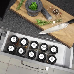 Dankzij de brede opening is het potje eenvoudig te vullen en te reinigen. Past perfect in lades, op planken en op het aanrecht en helpt orde en een elegante uitstraling in elke keuken te behouden. Geschikt voor huishoudelijk gebruik en professionele keukens. Kan worden aangevuld met zelfklevende labels voor eenvoudige markering.
