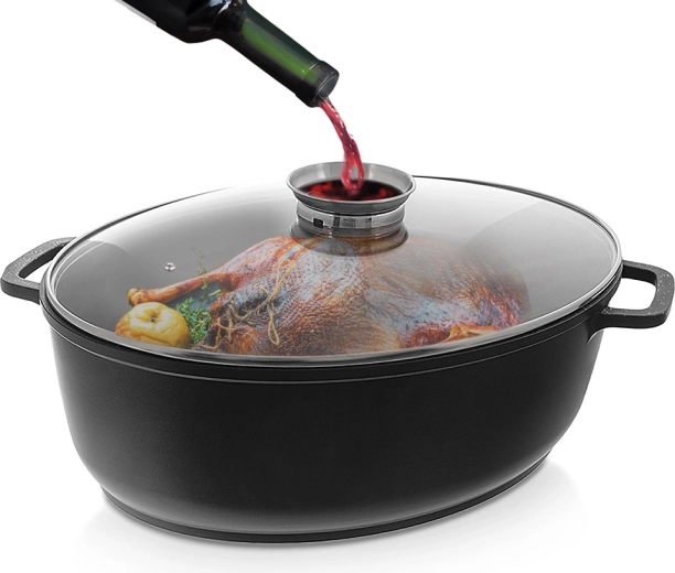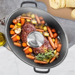 Robuuste gegoten aluminium braadslede met een topklasse granieten afwerking PFLUON GRANIT die warmte uitstekend opslaat en gerechten langer warm houdt. Het glazen deksel maakt controle tijdens de bereiding mogelijk zonder onnodig openen, en de geïntegreerde vulopening laat je water of wijn toevoegen of vloeibare kruiden doseren tijdens het braden.