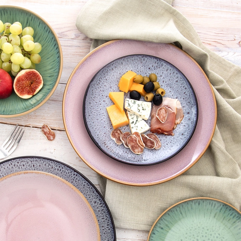 De reactieve, subtiel gespikkelde glazuur geeft het bord een originele uitstraling en elk stuk oogt uniek op de gedekte tafel.