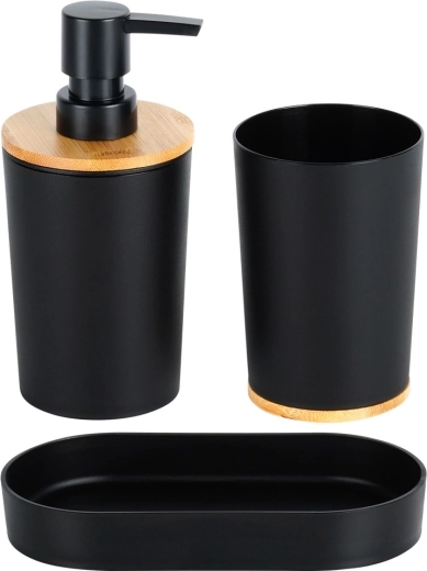 Elegante zwarte badkamerset bestaande uit een zeepdispenser, tandenborstelbeker en compacte tray. Combineert een matzwarte afwerking met bamboe-details voor een moderne look, bespaart ruimte rond de wastafel en helpt orde en organisatie te behouden in elke badkamer.