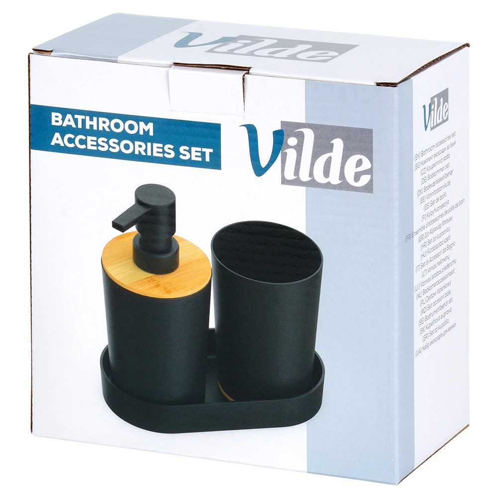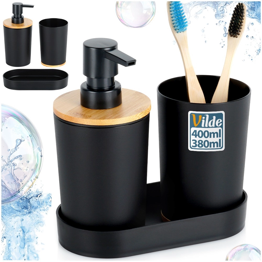 Deze praktische set is ideaal voor dagelijks gebruik bij de wastafel. Een dispenser voor vloeibare zeep met soepele pompbediening, een ruime beker voor tandenborstels of tandpasta en een stabiele tray vormen samen een samenhangend en netjes geheel. Matzwart in combinatie met natuurlijk bamboe oogt stijlvol in zowel moderne als klassieke interieurs.
