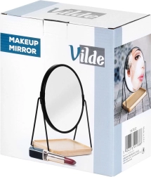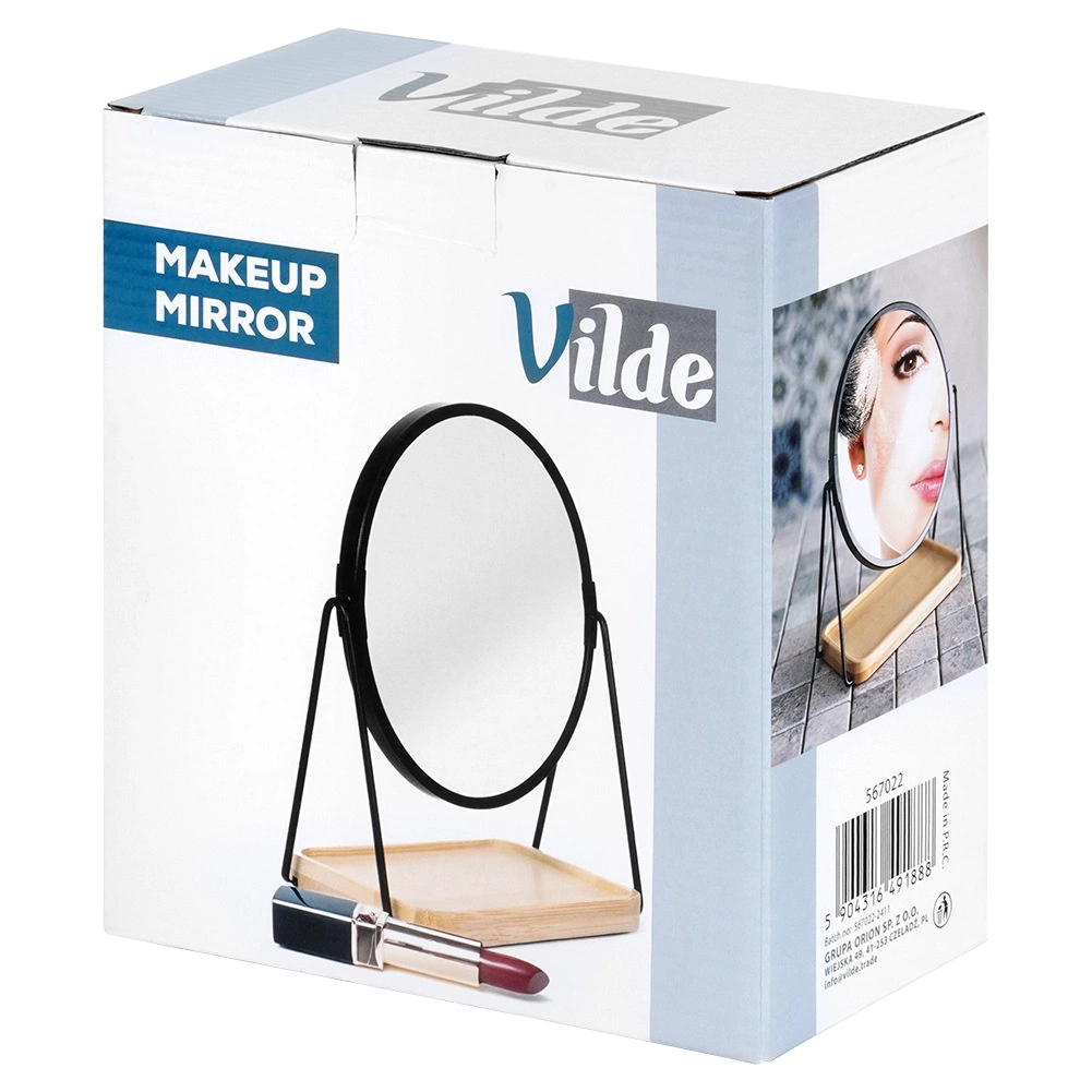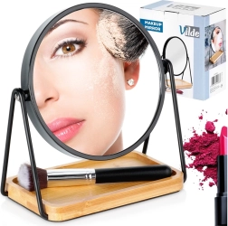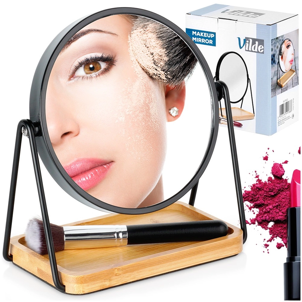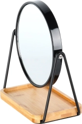 De dubbelzijdige cosmeticaspiegel met een spiegeloppervlak van 15 cm in diameter is ideaal voor dagelijkse make-up, het bijwerken van de wenkbrauwen en gedetailleerde verzorging. De stabiele metalen standaard in zwart wordt aangevuld met een natuurlijke bamboe basis die tevens dient als een praktisch aflegbakje voor kwasten, cosmetische accessoires of sieraden. Het minimalistische design in een combinatie van wit en hout past moeiteloos in moderne interieurs.