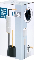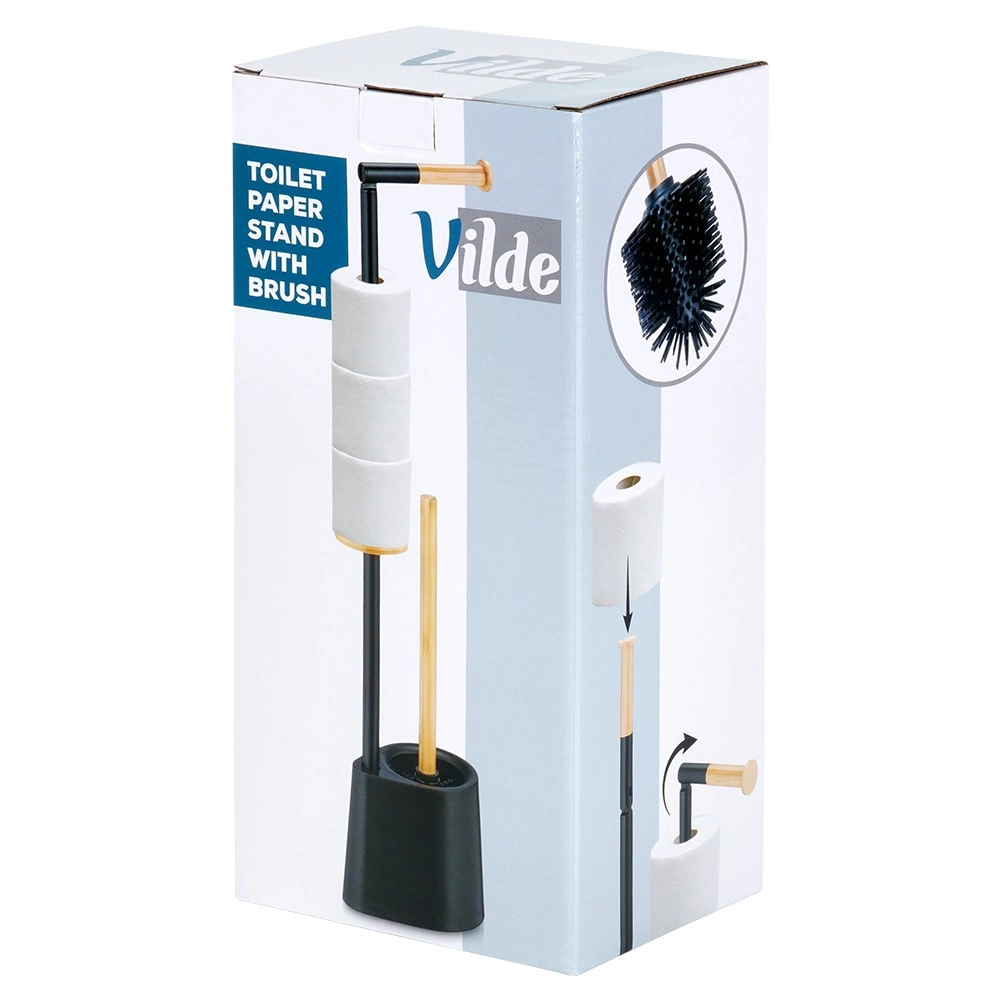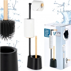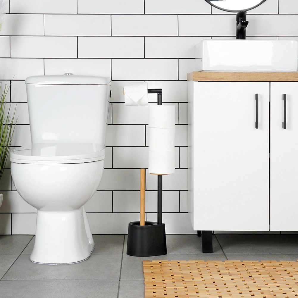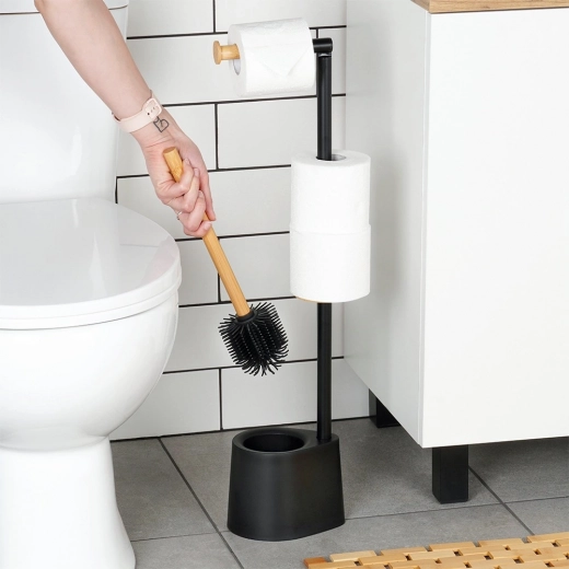 Houd de badkamer overzichtelijk met de doordachte standaard die toiletpapier uitgeeft én tegelijk opbergt en is voorzien van een WC-borstel met siliconen borstelharen voor hygiënische reiniging. Het minimalistische ontwerp in het zwart met een natuurlijke bamboe-accent oogt stijlvol en tijdloos.