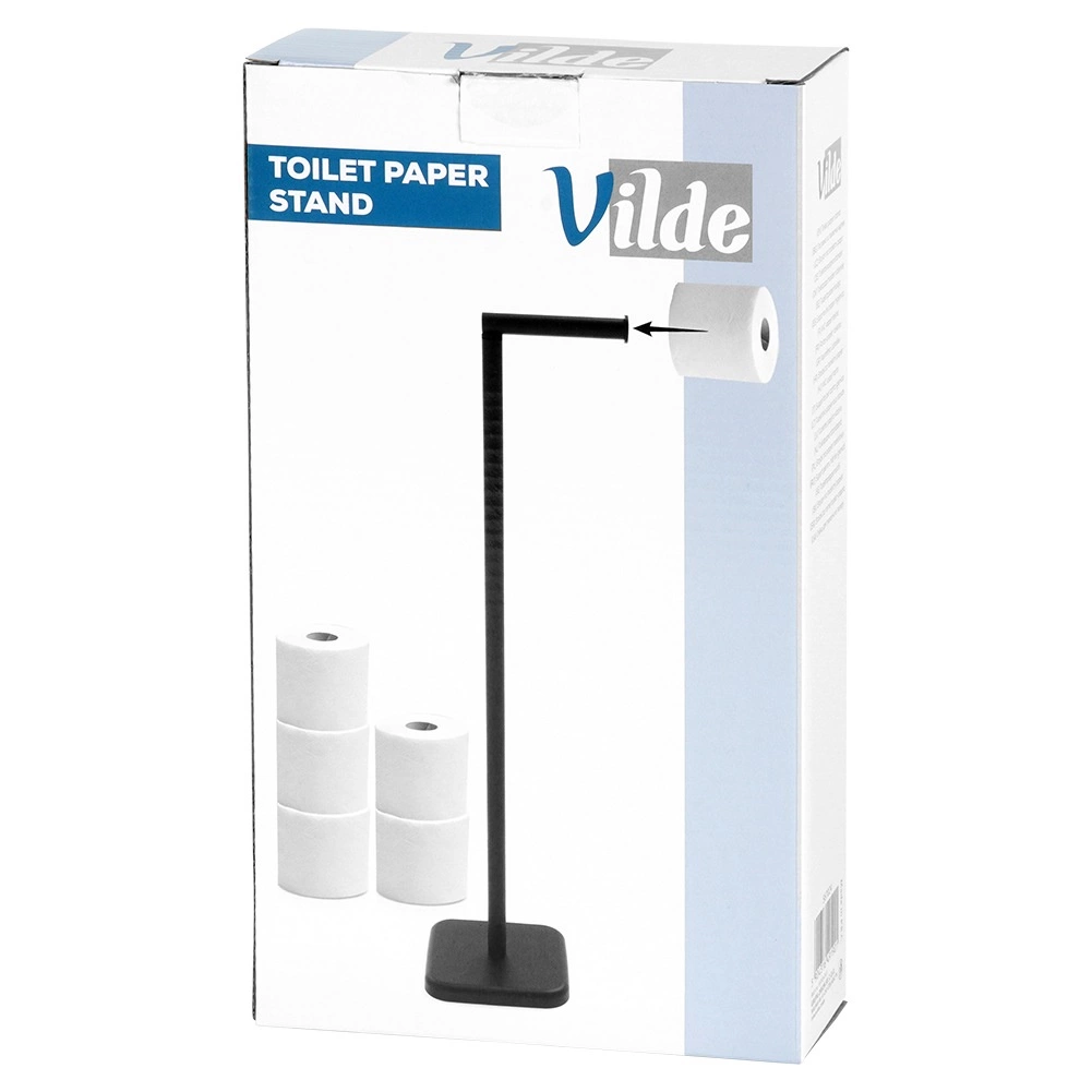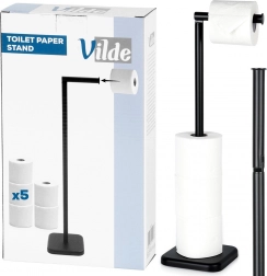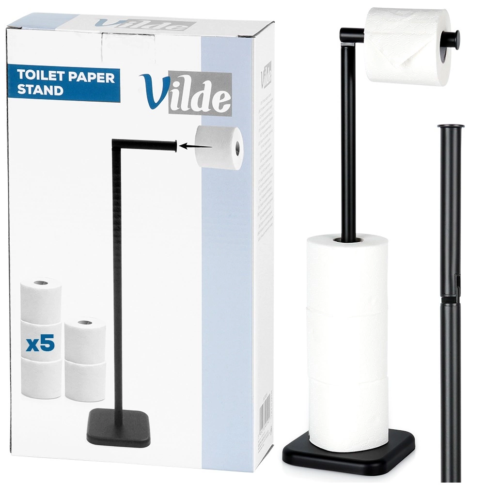 Deze vrijstaande wc-rolhouder van VILDE combineert een minimalistische look met maximale functionaliteit. De bovenste arm dient voor comfortabel afrollen en kan ook verticaal worden geplaatst, waardoor extra ruimte voor een rol ontstaat (de hoogte bedraagt dan ca. 69,5 cm). De robuuste constructie en de tijdloze zwarte afwerking passen in zowel moderne als klassieke interieurs.