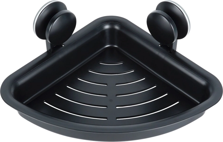Praktische hoekdoucheplank met montage via zuignappen voor een stabiele opbergruimte zonder boren. In matzwart, met afvoergaten voor snel drogen en eenvoudige reiniging. Ideaal voor douchegels, shampoos, zeep en sponzen op gladde oppervlakken zoals tegels of glas.