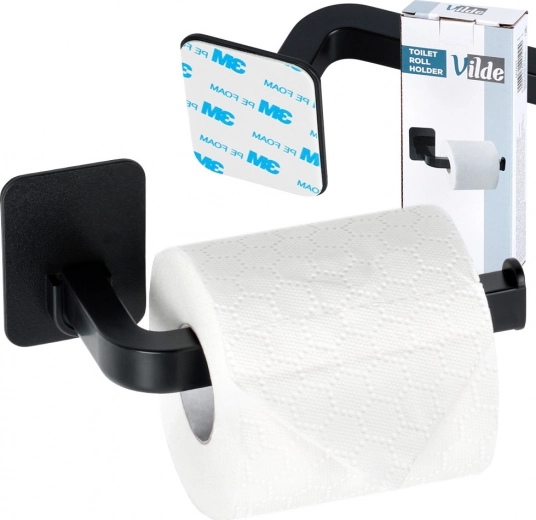 Elegante wc-rolhouder in het zwart met 3M zelfklevende montage zonder boren. Compacte afmetingen 16,5 × 7 × 6,5 cm, modern minimalistisch design, eenvoudige rolvervanging en betrouwbare bevestiging op gladde oppervlakken.