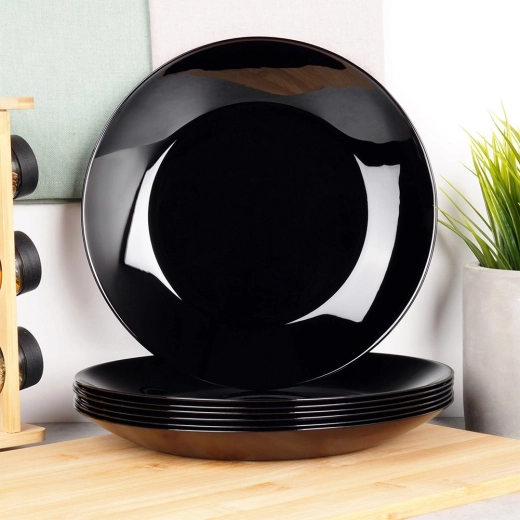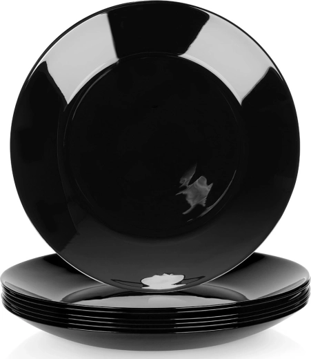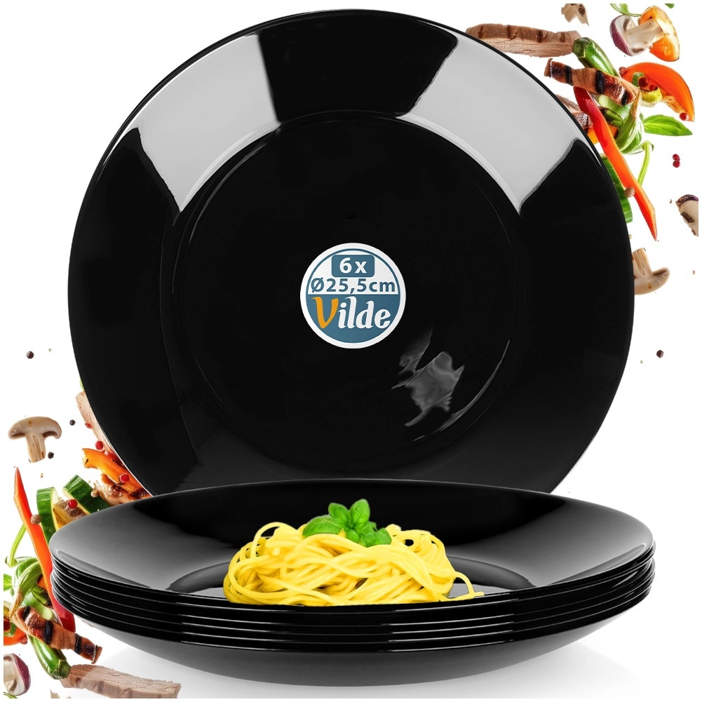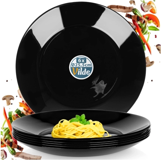 Set van 6 universele platte borden van hoogwaardig opaalglas met een elegante zwarte hoogglans. Dankzij de tijdloze look en duurzame afwerking vormen ze een perfecte aanvulling op uw tafeluitrusting – van dagelijkse lunch tot feestelijk diner. Het materiaal doet denken aan porselein, maar is praktisch in onderhoud en langdurig bestand tegen slijtage.