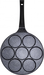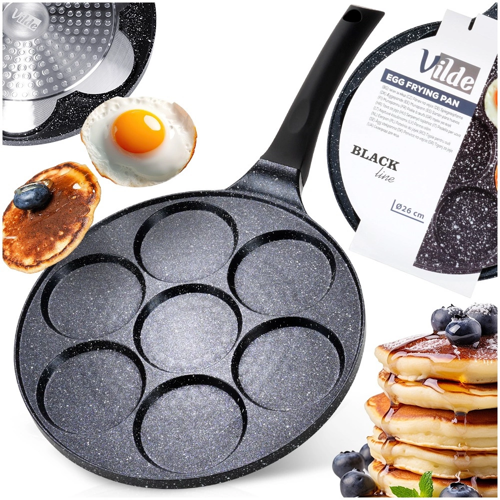 Zeven ondiepe uitsparingen met een diameter van 8 cm zorgen voor gelijkmatig gevormde pannenkoekjes en eitjes – elegant serveren zonder moeite.