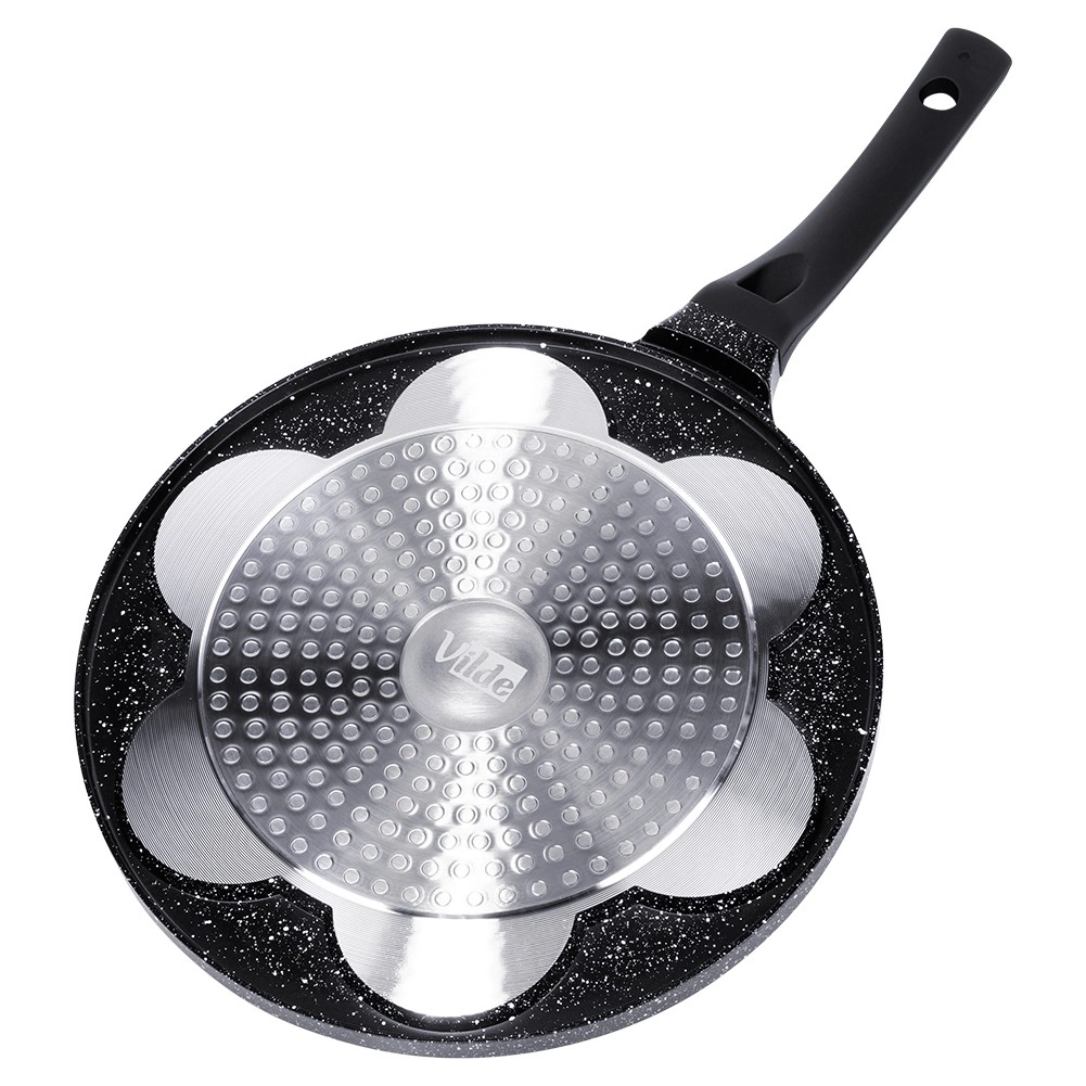 De meerlaagse bodem geleidt de warmte efficiënt over het hele oppervlak van de pan, verkort de bereidingstijd en zorgt voor gelijkmatige garing.