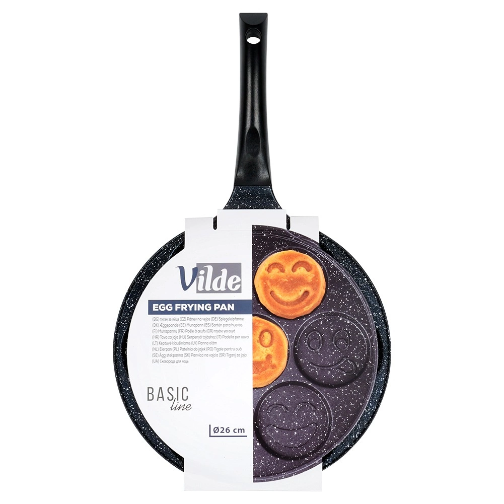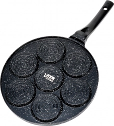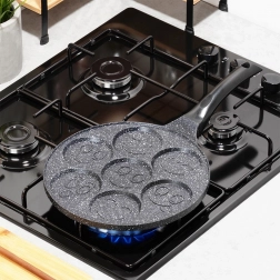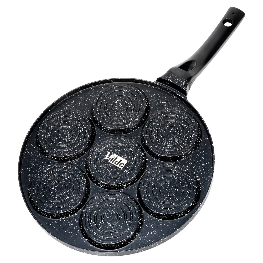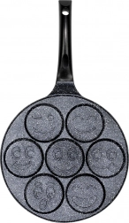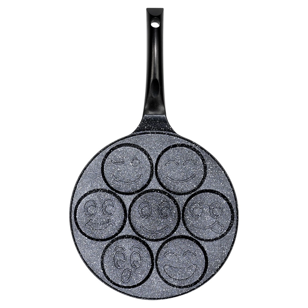Maak het perfecte ontbijt voor het hele gezin: 7 ronde openingen met vrolijke “smiley”-motieven toveren gelijkmatige porties pannenkoekjes, mini pancakes of spiegelei. De anti-aanbak granietlaag zorgt voor eenvoudig omdraaien en serveren en minimaliseert de oliebehoefte.