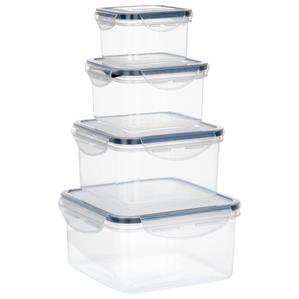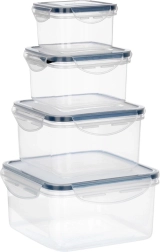 Praktische set van vier transparante voedselcontainers met stevige klikdeksels en siliconen afdichting voor een luchtdichte en lekkagevrije afsluiting. Verschillende formaten (1,2 l, 700 ml, 400 ml, 170 ml) voor georganiseerde opslag van voedsel thuis en onderweg. BPA-vrij, geschikt voor de vaatwasser, magnetron (zonder deksel) en vriezer.