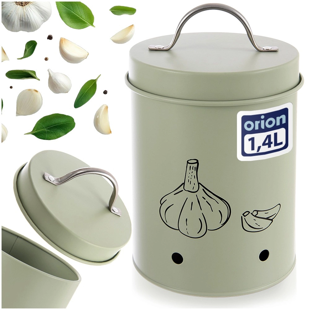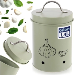 Stijlvolle en praktische container voor het bewaren van groente en fruit, ideaal vooral voor knoflook. Dankzij het volume van 1,4 l, de effectieve ventilatie en het deksel met comfortabele greep blijven etenswaren langer vers. Gemaakt van duurzaam metaal in pastelgroen, ook geschikt als decoratief element in de keuken.