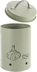 Dankzij de compacte afmetingen past de container gemakkelijk op het aanrecht en in de voorraadkast. De pastelgroene uitvoering met zilverkleurige greep past perfect in zowel moderne als rustieke keukens. De knoflookgrafiek maakt snelle herkenning van de inhoud tussen andere potten eenvoudig.