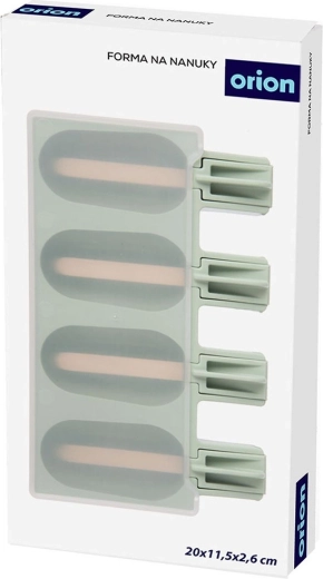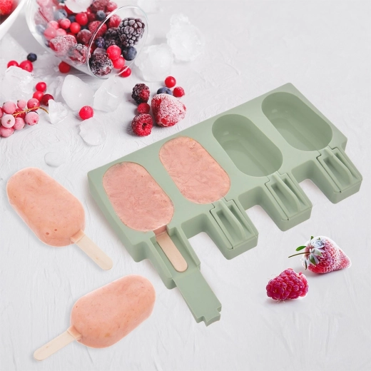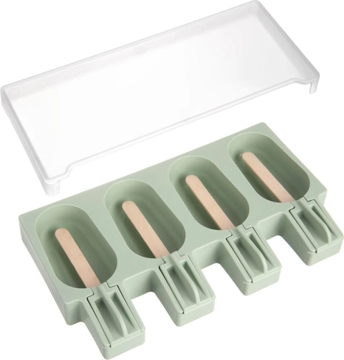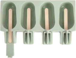 De vorm is gemaakt van hoogwaardige siliconen in pastelgroen, het deksel is transparant. Geschikt voor vaatwasser, vriezer en magnetron en bestand tegen temperaturen van -20 °C tot +120 °C. In de verpakking zitten 24 houten stokjes. Afmeting van de hele vorm is 20 × 11,5 × 2,6 cm, grootte van één ijsje ca. 7 × 4 cm.