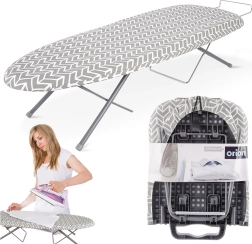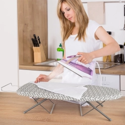 Compacte tafelstrijkplank voor kleine appartementen, studentenkamers en reizen met een stabiele metalen constructie, antislipvoetjes en een comfortabele katoenen hoes met viltvulling. Voorzien van een uitschuifbare houder voor het strijkijzer, eenvoudig uit te klappen en neemt opgevouwen minimaal ruimte in.
