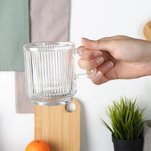 Ontdek de universele glazen met oor, perfect voor thee, koffie, water, limonades en sappen. Dankzij de geribbelde structuur liggen ze prettig in de hand, glijden ze niet en ogen ze modern en verzorgd op tafel. Het praktische volume van 350 ml is geschikt voor dagelijks gebruik en voor het serveren van drankjes aan gasten.