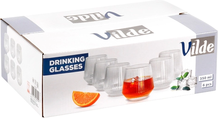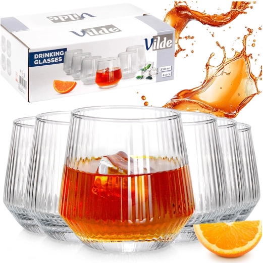 Elegante set van zes glazen met een inhoud van 350 ml en een geribbelde structuur voor een zekere grip en een moderne uitstraling. Gemaakt van hoogwaardig, dik glas, ideaal voor water, limonade, cocktails en whisky. De glazen zijn vaatwasmachinebestendig en perfect voor dagelijks gebruik, zowel thuis als in de horeca.