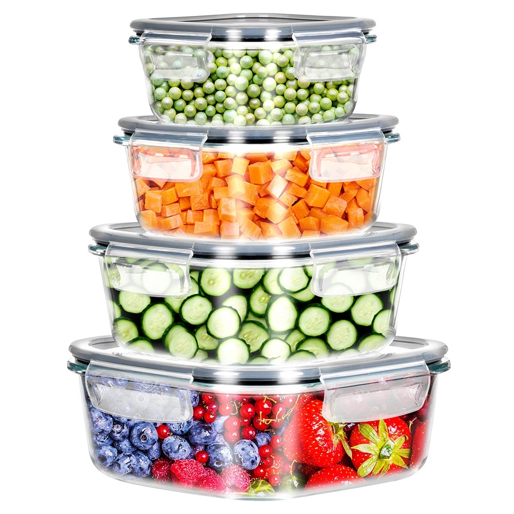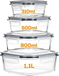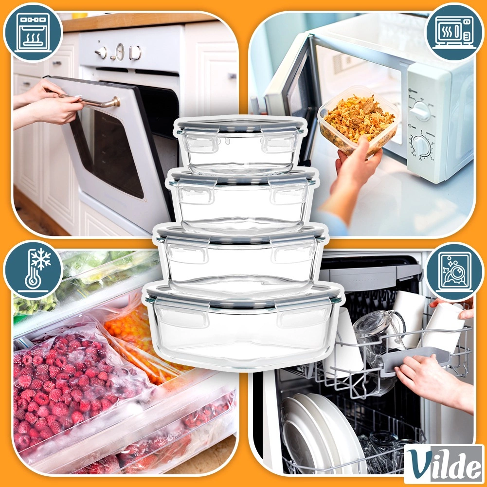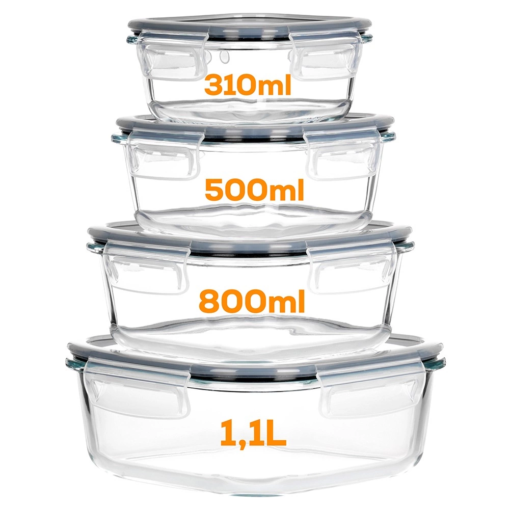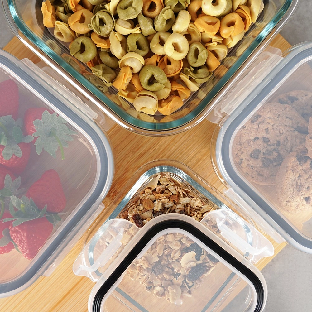 Houd je keuken overzichtelijk en je eten langer vers. De glazen bakjes van duurzaam borosilicaatglas hebben heldere wanden voor snel zicht op de inhoud en deksels met vier stevige clips en een zwarte siliconen afdichting die lekken en geuroverdracht voorkomen. Ideaal voor meal prep, het bewaren van restjes en het meenemen van snacks.