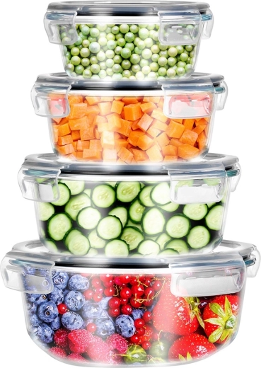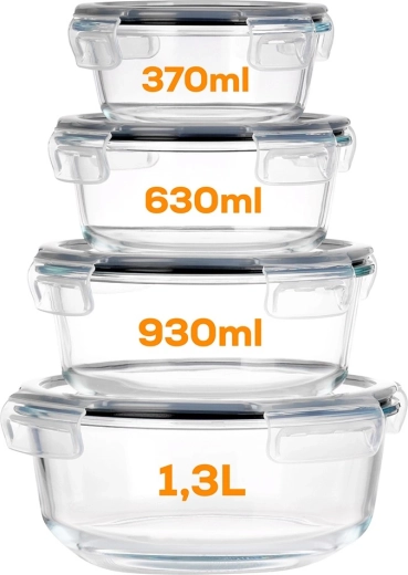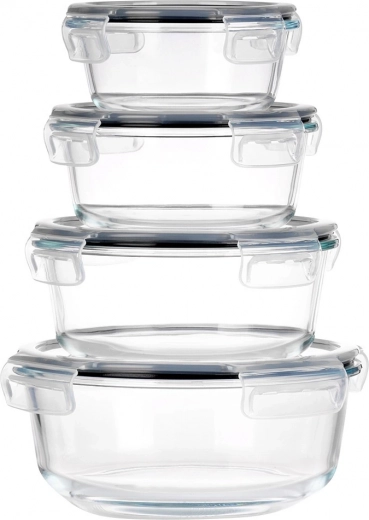 Praktische set van vier ronde glazen bewaardozen met deksels en siliconen afdichting voor een luchtdichte en lekvrije bewaring van maaltijden en ingrediënten. Het duurzame borosilicaatglas is geschikt voor de oven en magnetron (zonder deksel), de vaatwasser en de vriezer. Vier verschillende maten passen in elkaar om ruimte te besparen, terwijl de transparante wanden snel zicht op de inhoud bieden.