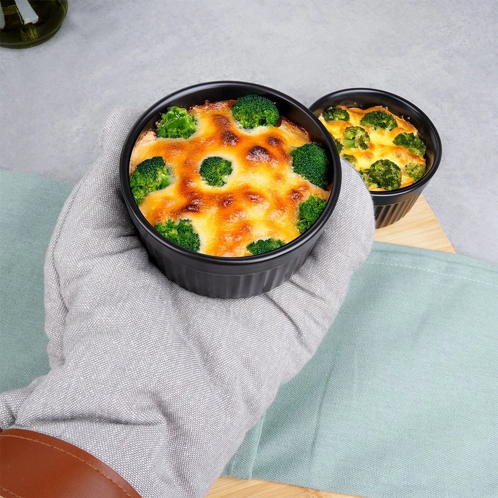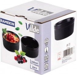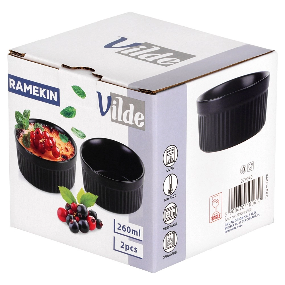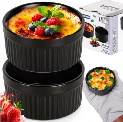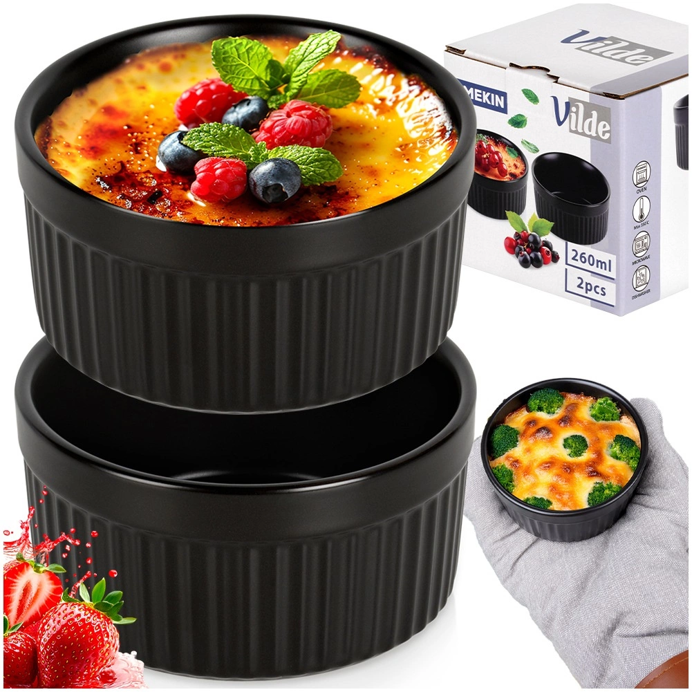 Elegante ovenschaaltjes met een inhoud van 260 ml in het zwart, ideaal voor bakken en serveren van desserts en hartige lekkernijen. De duurzame porseleinen constructie zorgt voor een gelijke warmteverdeling, gebruik in oven, magnetron en vaatwasser en comfortabel serveren van individuele porties. Perfect voor crème brûlée, soufflé, gegratineerde groenten en sauzen.