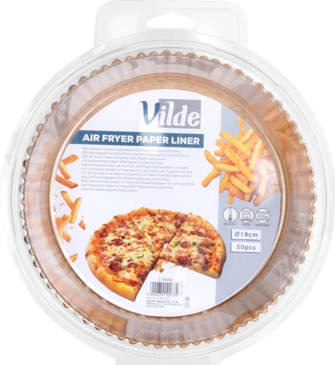Houd je heteluchtfriteuse perfect schoon met de praktische papieren inlegvellen van VILDE. De verpakking bevat 50 ronde bakcupjes met een diameter van 19 cm (onderkant 16 cm, hoogte 4,5 cm), die vet- en waterbestendig zijn, een antiaanbaklaag hebben en wegwerp zijn voor maximaal gemak. Geschikt voor de heteluchtfriteuse, oven en magnetron en ideaal voor eenvoudig serveren zonder knoeien.