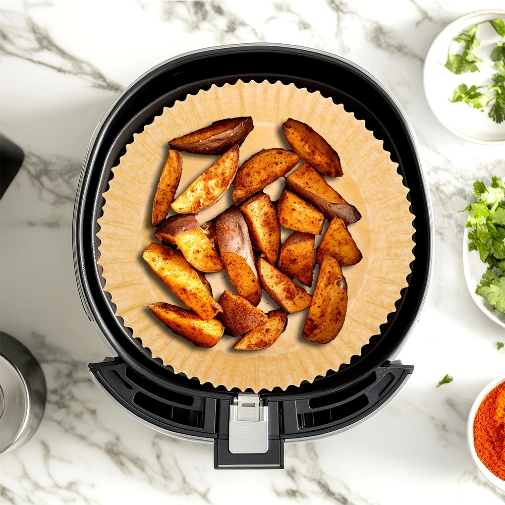 De papieren inlegvellen voor de heteluchtfriteuse van VILDE besparen schoonmaaktijd en verlengen de levensduur van de friteusemand. Ze voorkomen direct contact van voedsel met het oppervlak van de mand, waardoor aanbranden wordt geminimaliseerd en het uitnemen van het eten makkelijker wordt. Ze zijn gemaakt van hoogwaardig, geolied papier dat geschikt is voor contact met levensmiddelen, stevig is, vet- en waterbestendig en geen geuren of smaken overdraagt.