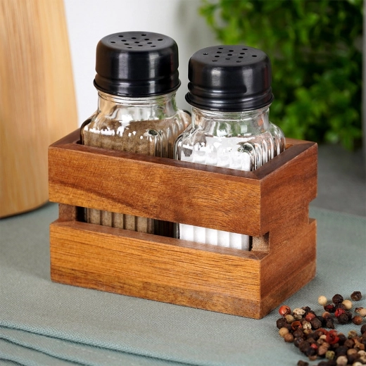 Deze 3-delige set verenigt functionaliteit en stijl: twee glazen strooiers (voor zout en peper) worden aangevuld met een compacte houder van acaciahout, die het dragen en organiseren op tafel vergemakkelijkt. Geribbeld glas ligt prettig in de hand en de metalen schroefdop met gaatjes zorgt voor gelijkmatig strooien zonder risico op overdosering.