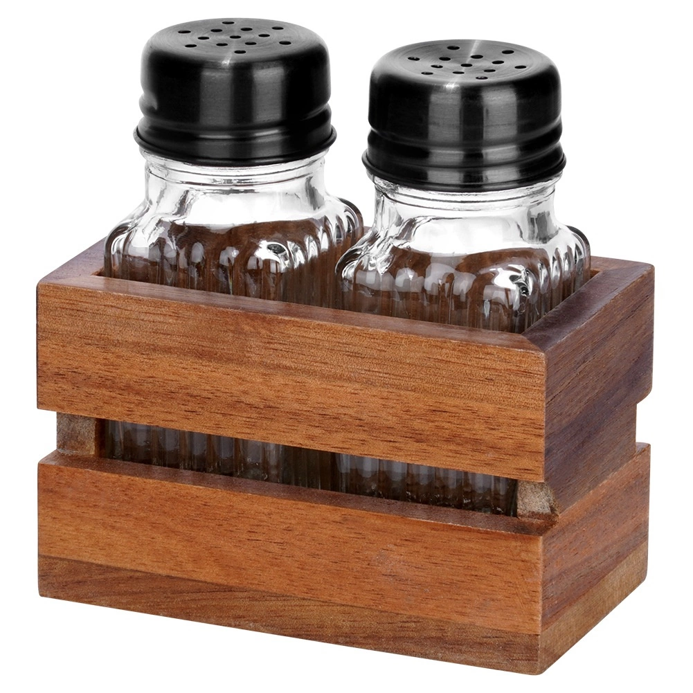De compacte houten houder houdt de strooiers bij elkaar, maakt verplaatsen gemakkelijk en geeft de tafel een natuurlijke, rustieke uitstraling.