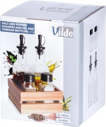 Deze stijlvolle set combineert functionaliteit en esthetiek: twee flessen voor olie en azijn met afsluitbare doseerders zorgen voor schoon en gelijkmatig op smaak brengen, terwijl de zout- en peperstrooier een precieze dosering bieden zonder onnodig gemors. Alles is opgeborgen in een stevige houder van acaciahout, zodat je smaakmakers altijd bij de hand en netjes geordend op het aanrecht of de eettafel staan.