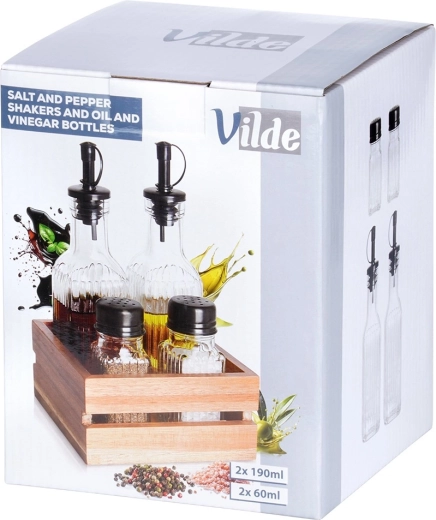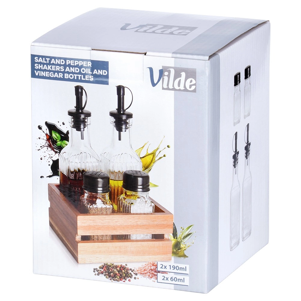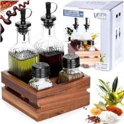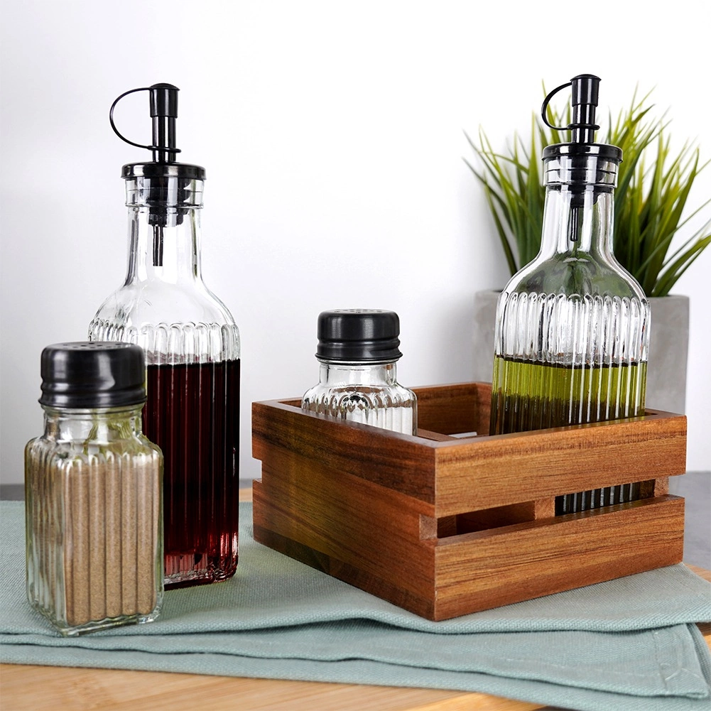 Design en materialen: de flessen en kruidenstrooiers zijn van glas met effectief ribbelpatroon; de doppen van de strooiers zijn zwart metaal, de doseerders zijn zwart en van duurzaam kunststof; de houder is van acaciahout voor stabiliteit en een lange levensduur.