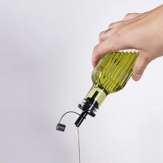 De olie- en azijnflessen hebben smalle schenktuiten met doppen die de doorstroming vertragen, druppelen voorkomen en een gelijkmatige verdeling over het eten vergemakkelijken.