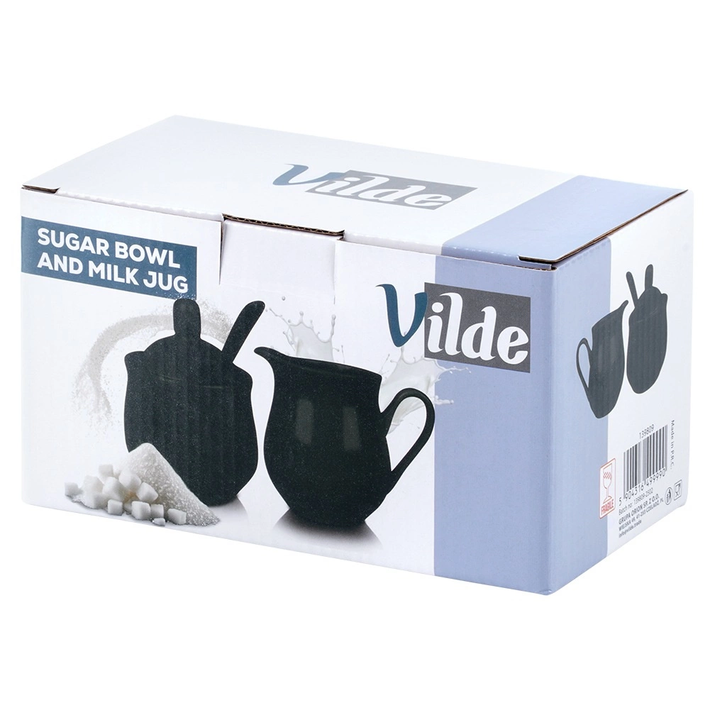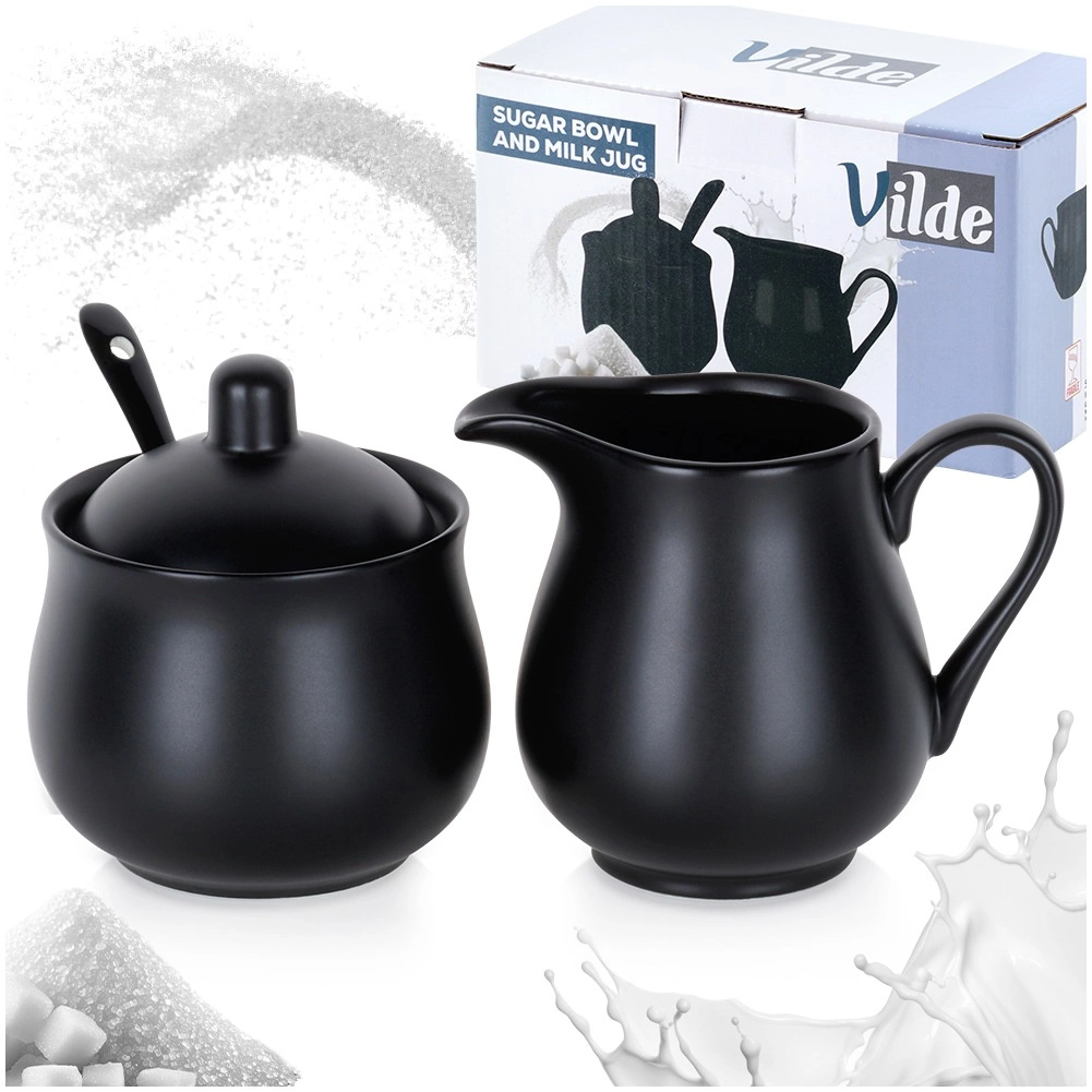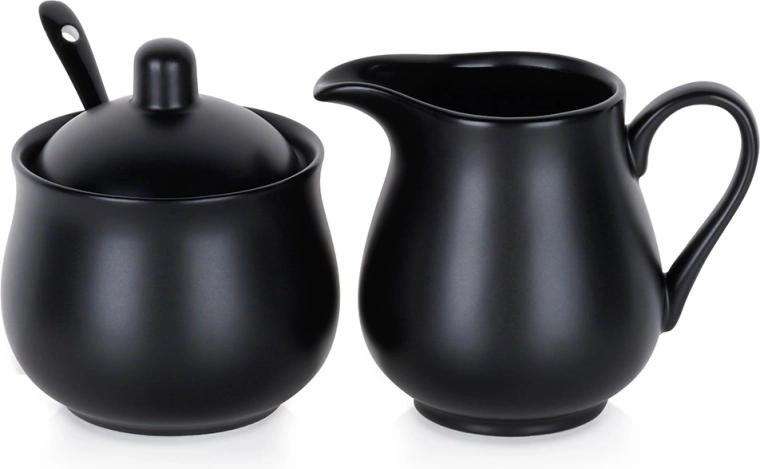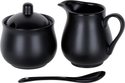 Elegante set voor het serveren van koffie en thee: porseleinen suikervaatje met deksel en lepeltje en melkkan met schenktuit en oor, beide met een inhoud van 150 ml. Hoogwaardig porselein in mat zwarte kleur, een modern design en makkelijk te reinigen in de vaatwasser maken deze set tot een stijlvol en praktisch accessoire voor zowel thuis als in de horeca.