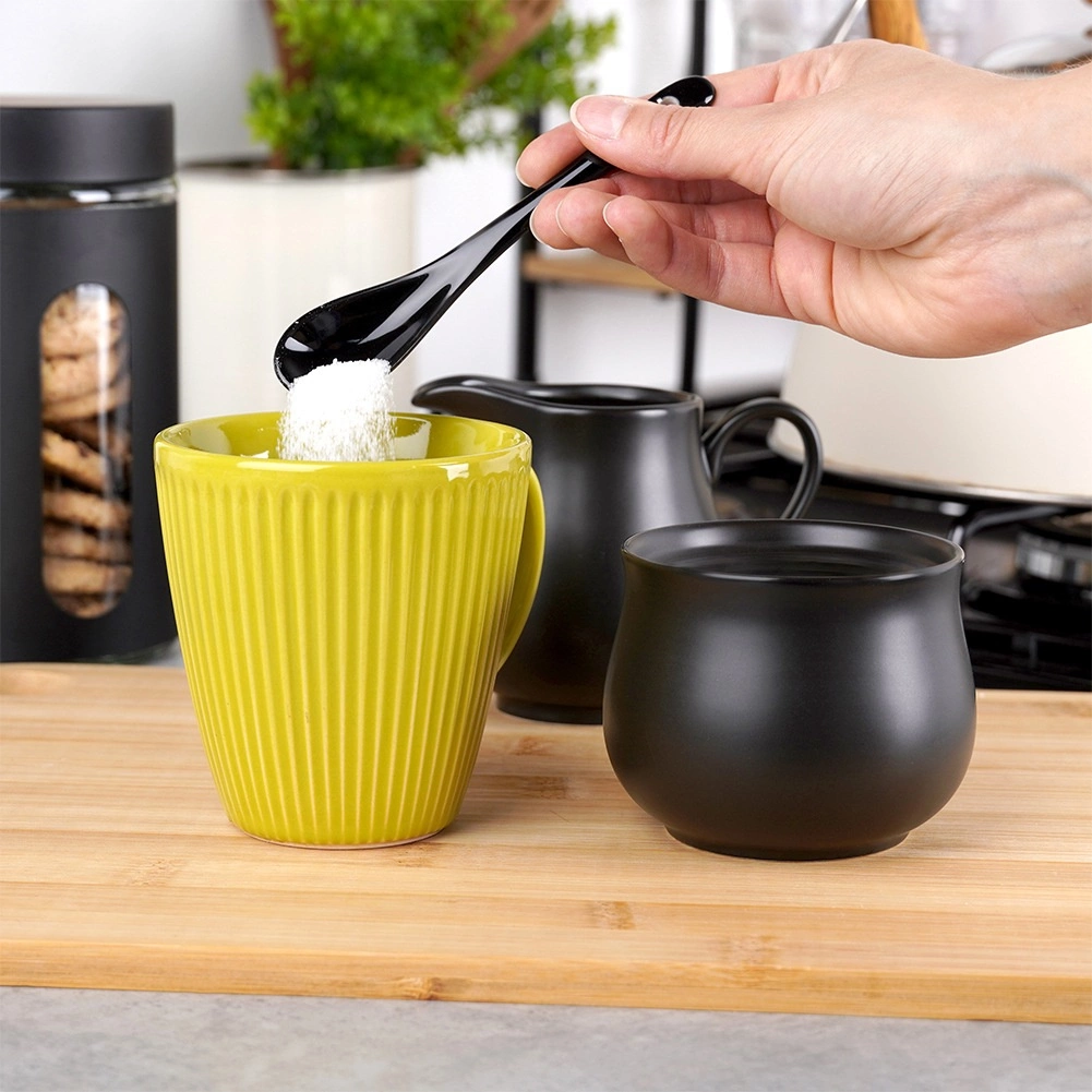Deze driedelige set combineert modern design met dagelijkse functionaliteit. De melkkan met ergonomisch oor en precieze schenktuit maakt het schenken van melk of room eenvoudig, terwijl het suikervaatje met deksel en lepeltje suiker hygiënisch bewaart. De matte zwarte uitvoering past uitstekend bij diverse soorten servies en geeft uw tafel een elegante toets.