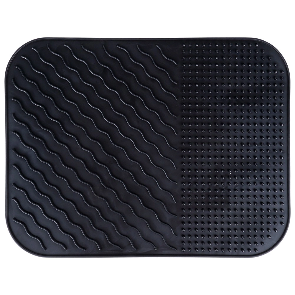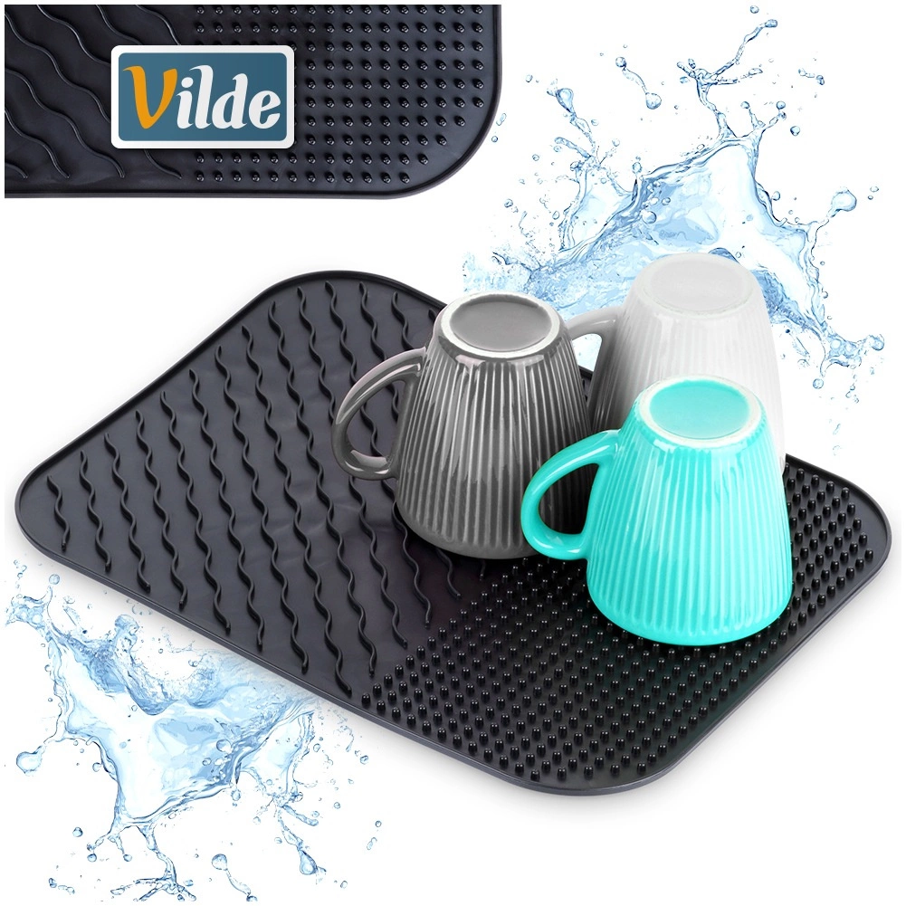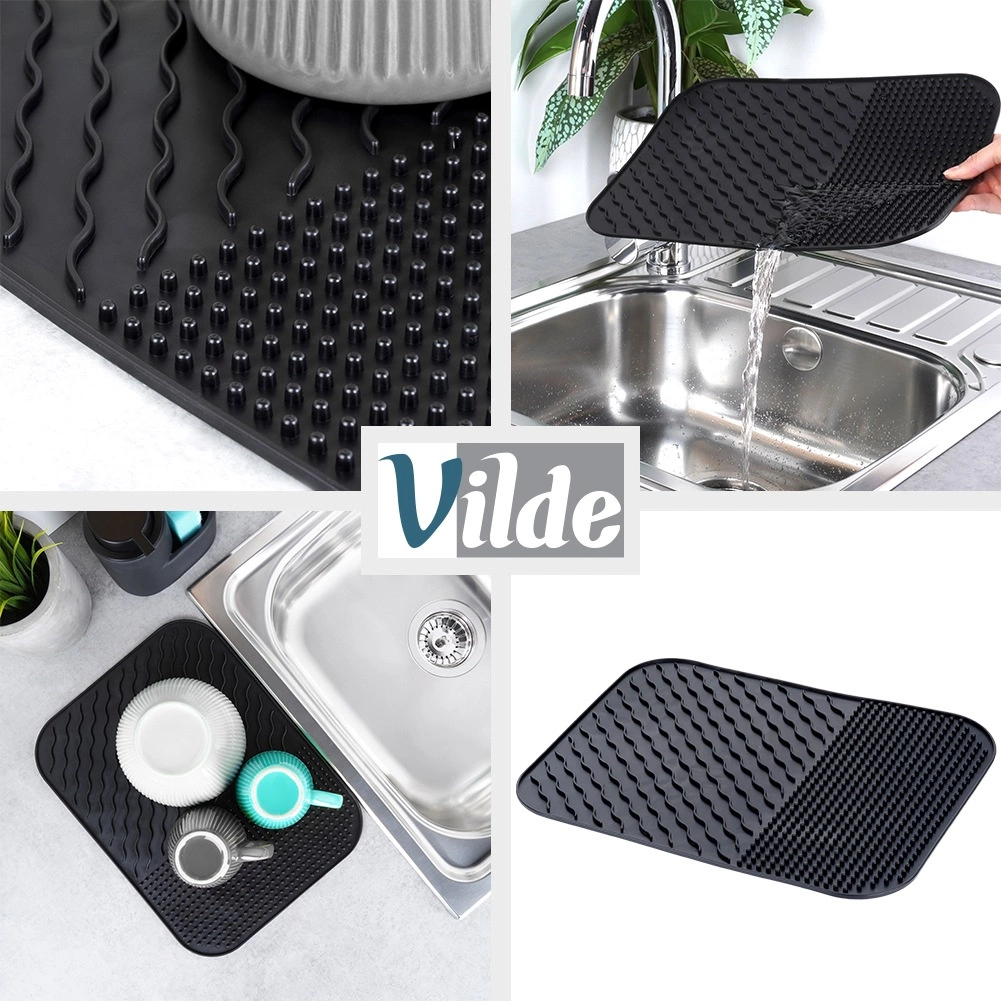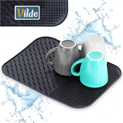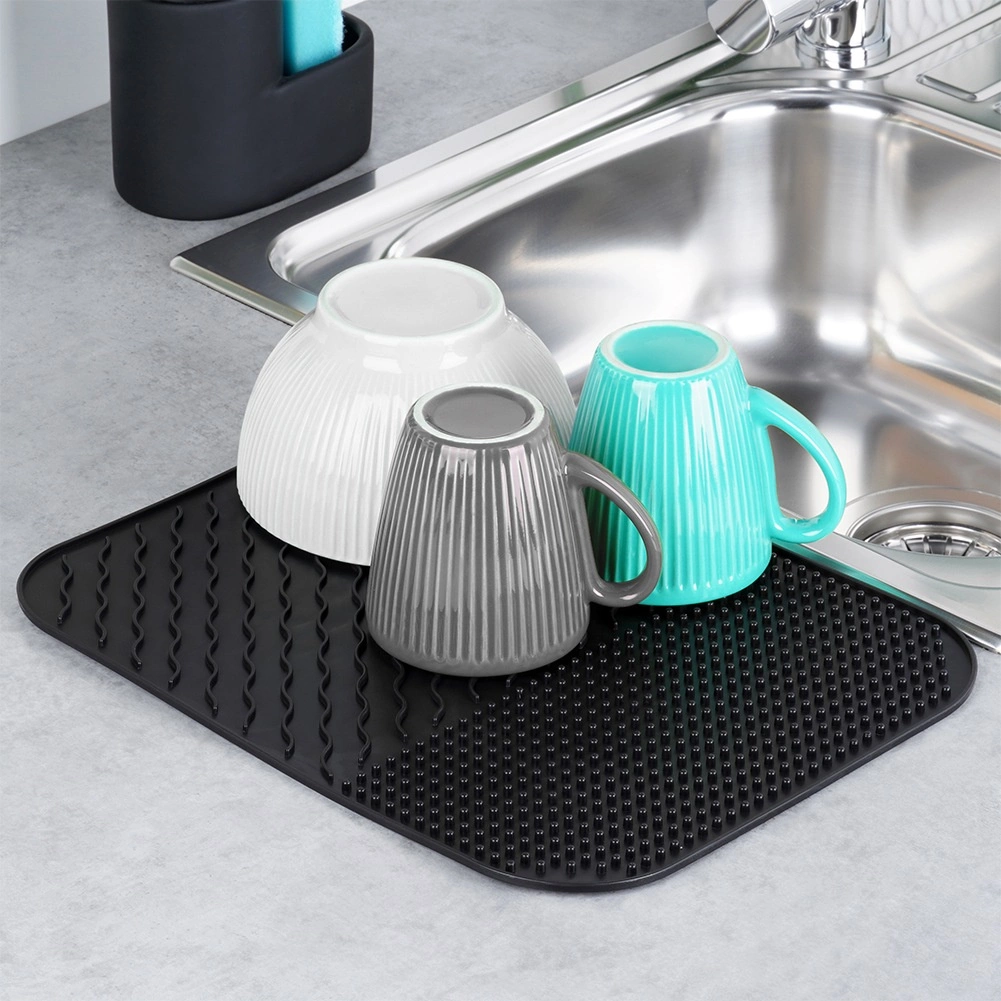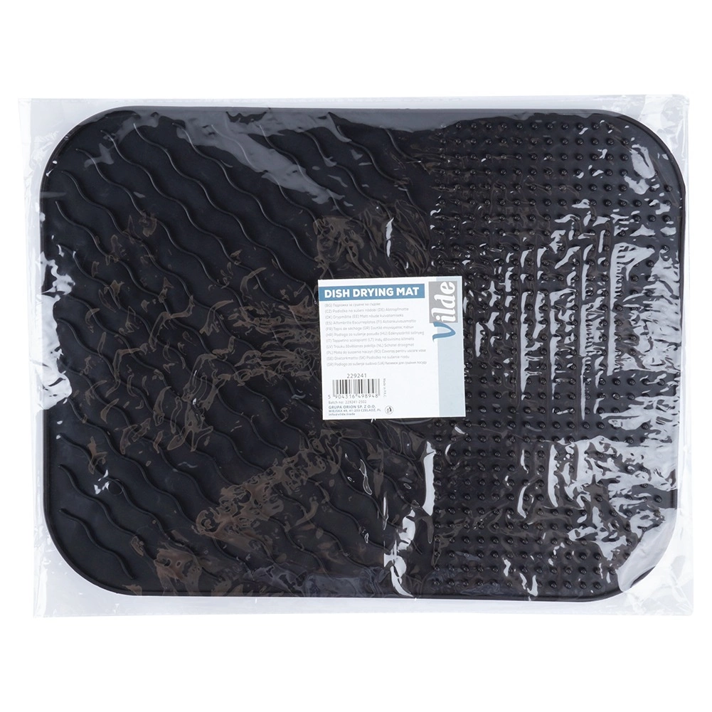 Een elegante en functionele vervanging voor een klassieke afdruiprek. De siliconen mat met afmetingen 34 × 26,5 × 0,4 cm biedt voldoende ruimte om vaat te drogen zonder veel plek in te nemen. Het minimalistische ontwerp in zwart past in elke keuken en houdt het aanrecht schoon en overzichtelijk.