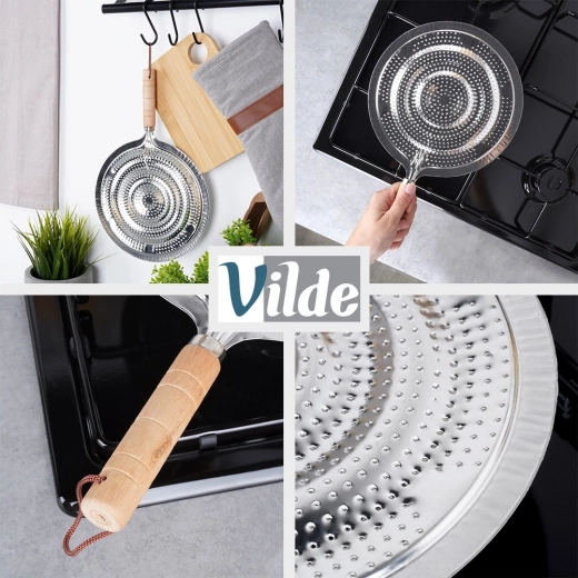Praktische metalen vlamverdeler voor gasfornuizen met een diameter van 21 cm en een totale lengte van 32,5 cm. Zorgt voor een gelijkmatige warmteverdeling, beschermt glazen en keramisch kookgerei tegen directe vlam en barsten en heeft een comfortabel houten handvat met lus om op te hangen.