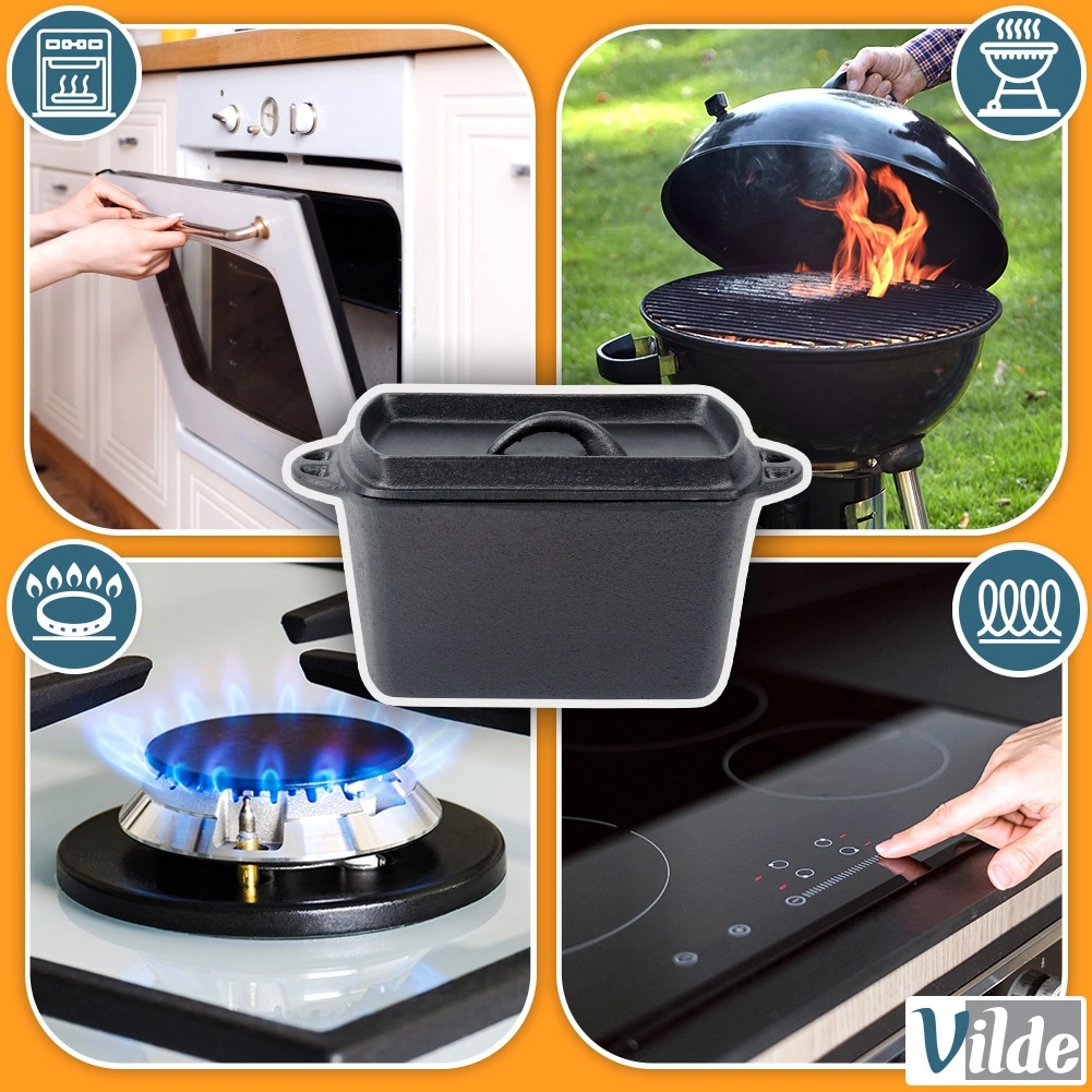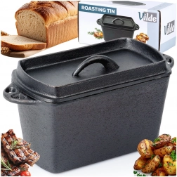 De vorm is universeel – te gebruiken voor brood, roer- en gistdeeg, lasagne, gegratineerde gerechten, vlees en groenten. U kunt hem gebruiken op gas-, elektrische, keramische, halogeen- en inductiekookplaten, evenals in de oven of direct boven het vuur. Inclusief deksel dat helpt vorm en vocht vast te houden.