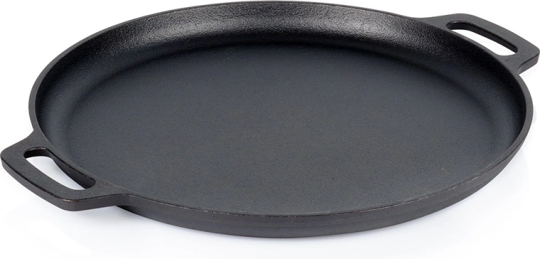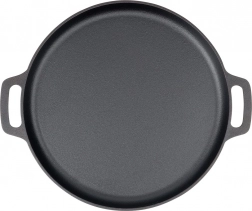 Deze massieve gietijzeren pan is een veelzijdige hulp voor dagelijks koken thuis, op de grill en boven open vuur. Dankzij het grote vlakke oppervlak en de lage rand is hij perfect voor steaks, eieren, pannenkoeken, tortilla’s, geroosterde aardappelen en pizza. Twee geïntegreerde handgrepen maken veilig overbrengen en serveren direct op tafel mogelijk.