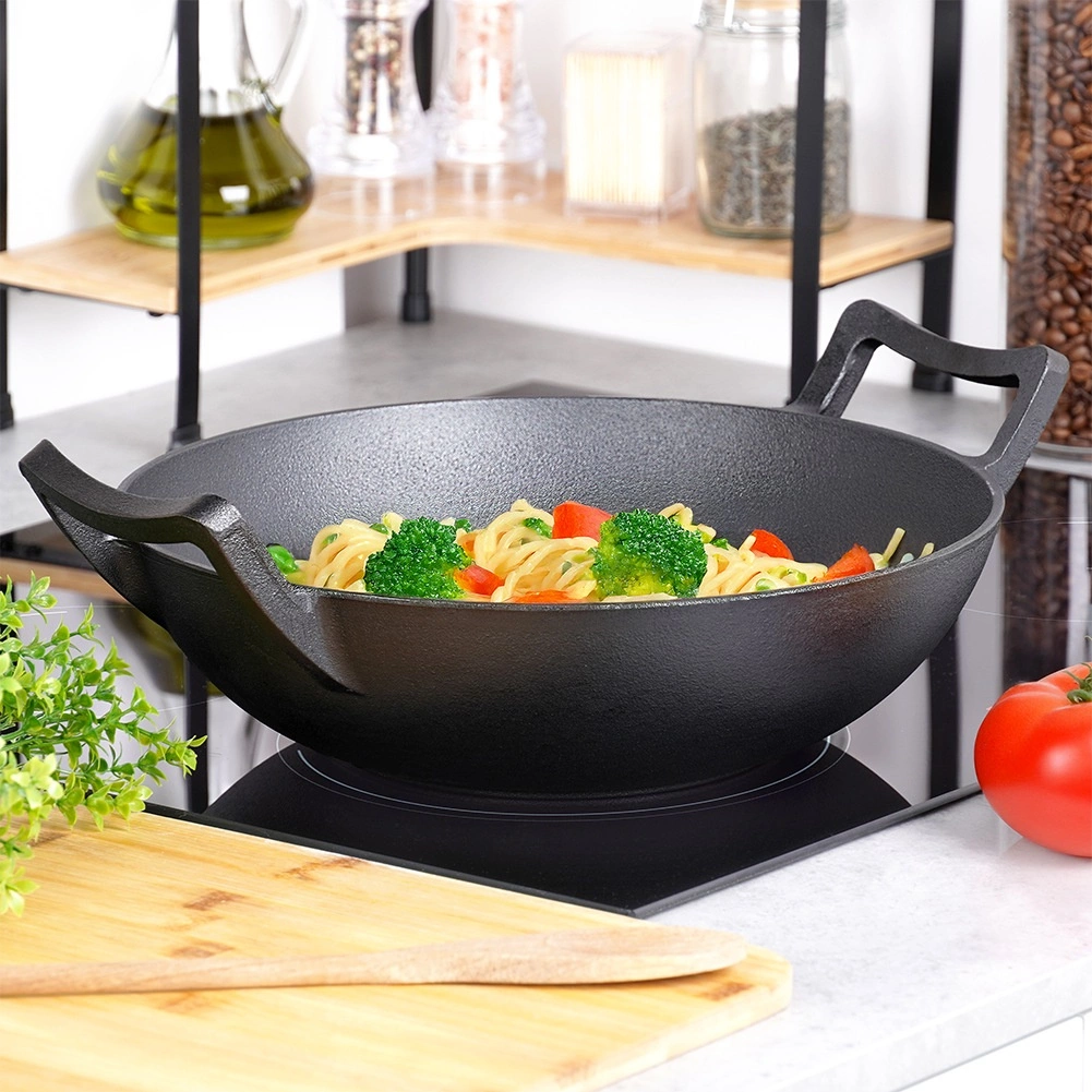Het massieve gietijzeren lichaam zorgt voor een stabiele temperatuur over het hele oppervlak – ideaal voor snelle stir-fry en langzaam stoven.
