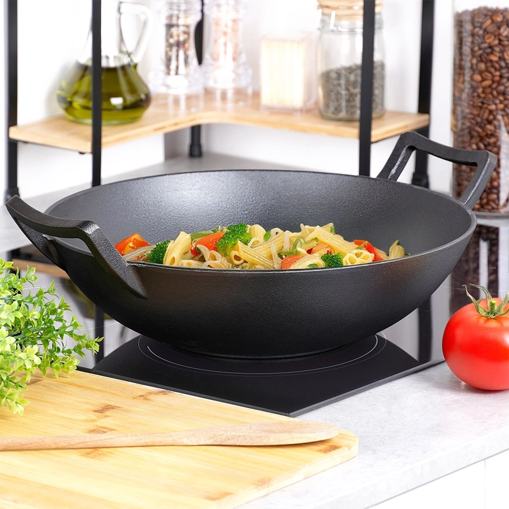 Gietijzer is een beproefd materiaal voor wokken – het houdt hoge temperaturen vast die je nodig hebt voor snel roerbakken, bakken en gratineren. Deze wokpan met een diameter van 36 cm biedt een diepe, ruime kom voor grote porties pasta, groenten, vlees en gerechten geïnspireerd op de Aziatische keuken. Dankzij de hittebestendigheid kun je hem zonder zorgen gebruiken op het fornuis, op de grill en in de oven.