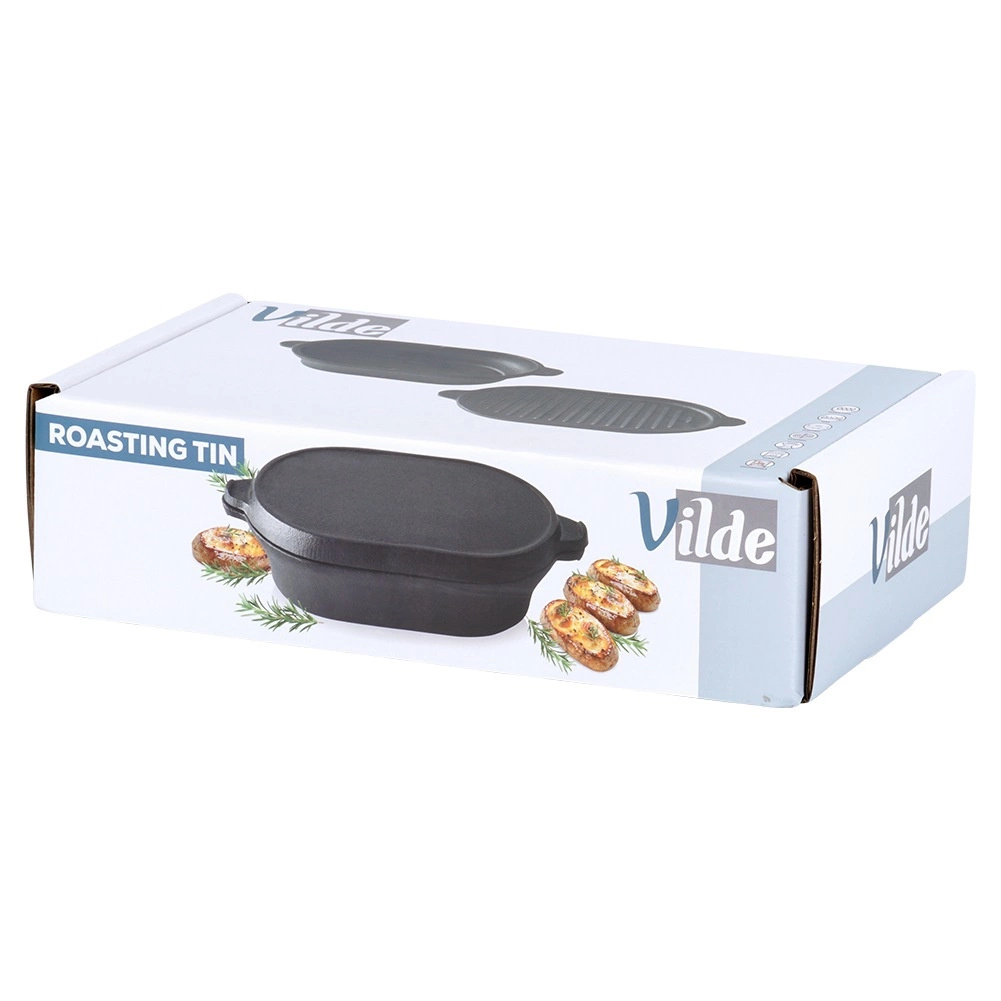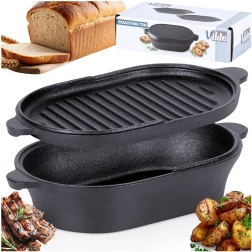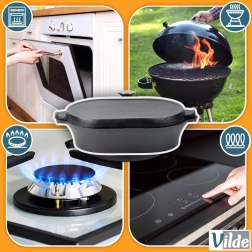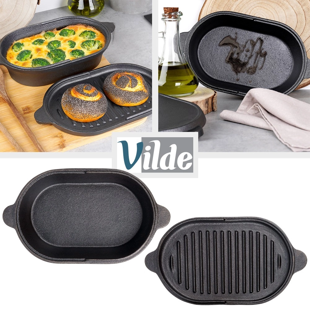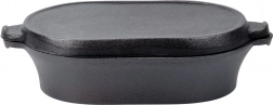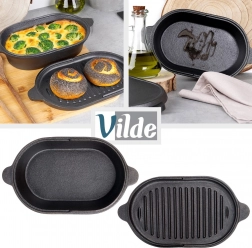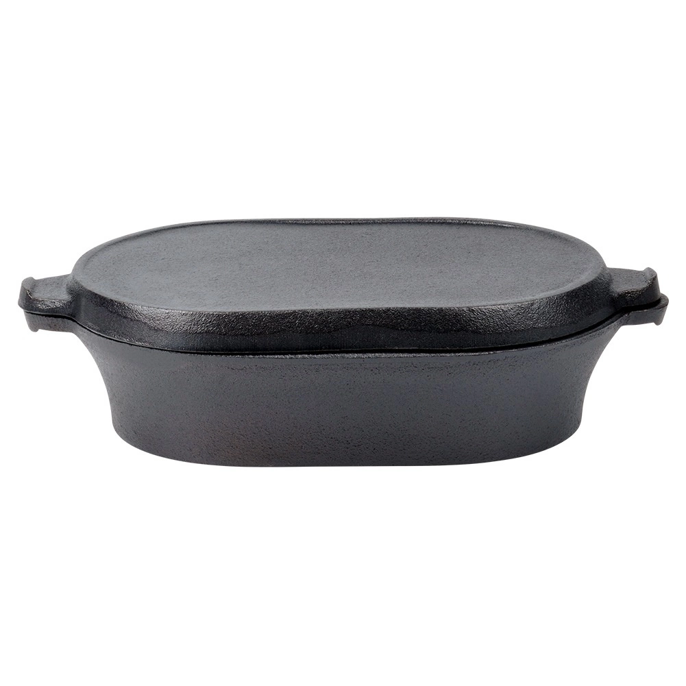 Deze ovale gietijzeren braadslede met praktisch 2-in-1 deksel is ontworpen voor dagelijks en feestelijk koken. Het onderste deel dient als diepere braadslede voor vlees, aardappelen of groenten, terwijl het deksel met een geribbelde bodem fungeert als aparte grillpan voor perfect dichtschroeien en een duidelijk grillpatroon.