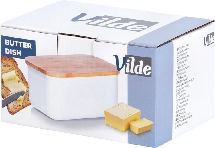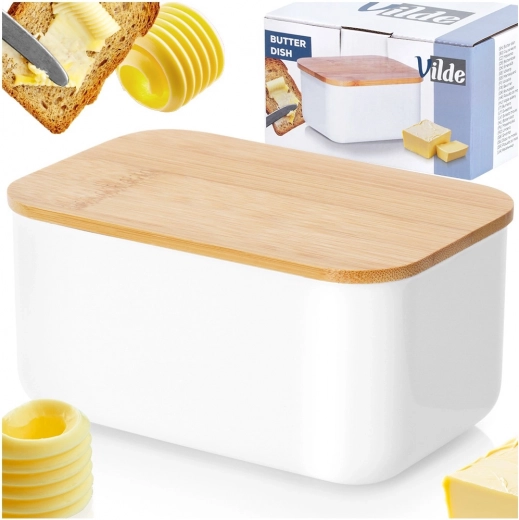 Elegante botervloot voor dagelijks gebruik, gecombineerd met duurzaam wit staal en een natuurlijk bamboe deksel voor stijlvol bewaren en serveren van boter. Dankzij de klassieke vorm en de compacte afmetingen past hij in elke keuken, houdt boter langer vers en is hij gemakkelijk schoon te maken.