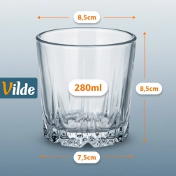 Deze set van zes glazen met een inhoud van 280 ml combineert tijdloos design met praktische eigenschappen. De exacte afmetingen van 8,5 × 8,5 cm zorgen voor een comfortabele grip en stabiliteit op tafel, terwijl de dikke bodem de drank beschermt tegen snel opwarmen door de hand. Het heldere glas accentueert de kleur van whisky en andere dranken en geeft je tafel een elegante uitstraling.