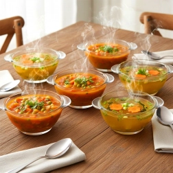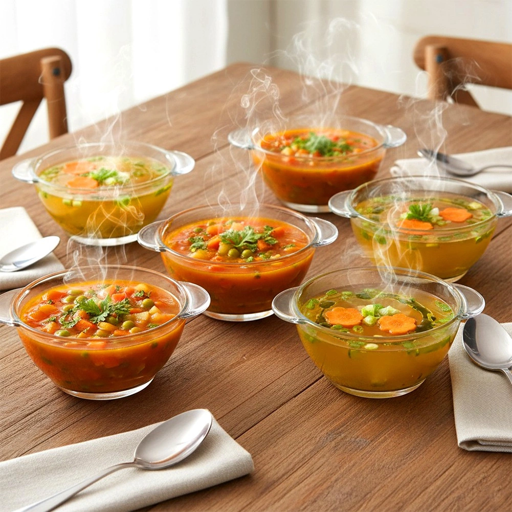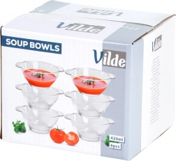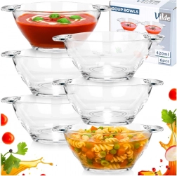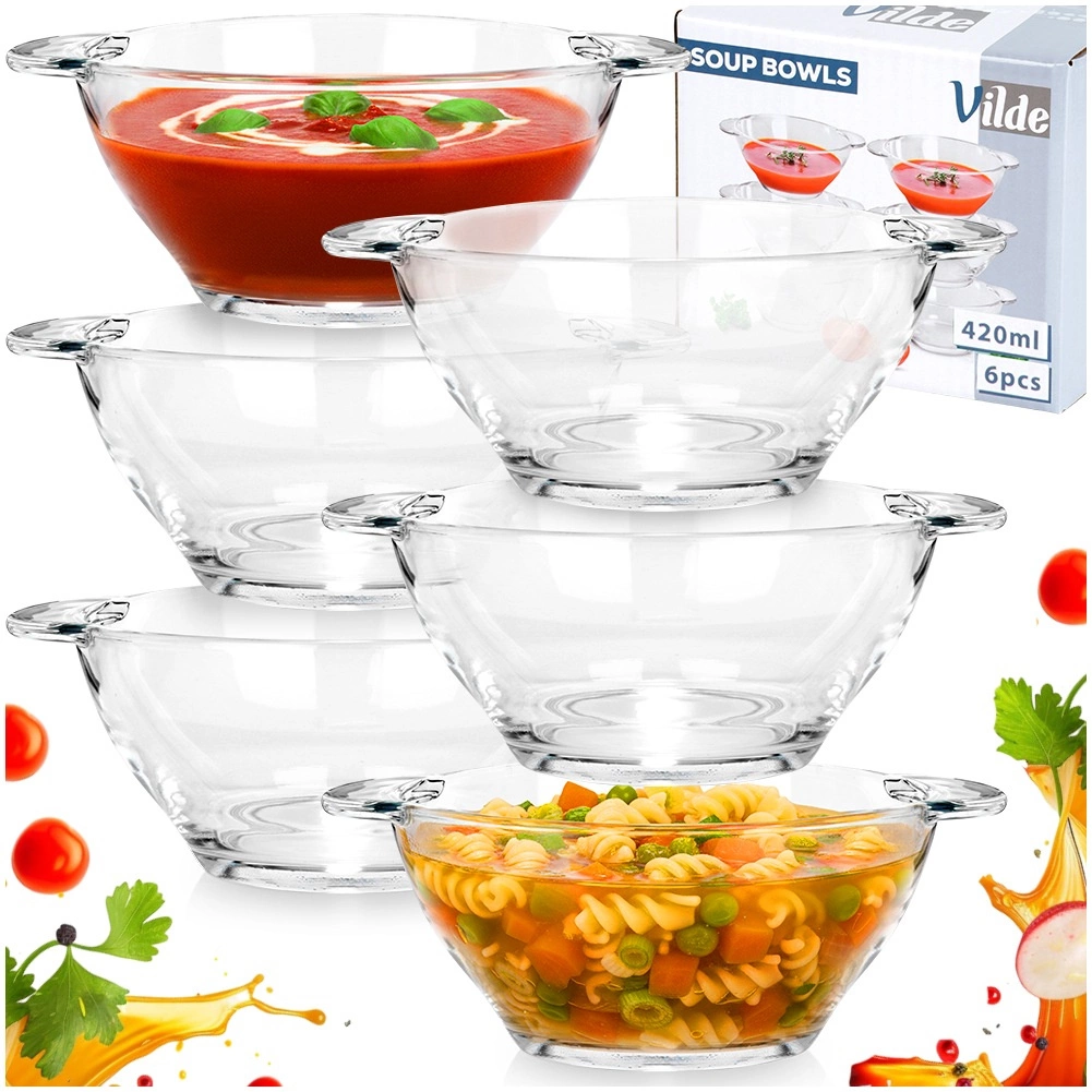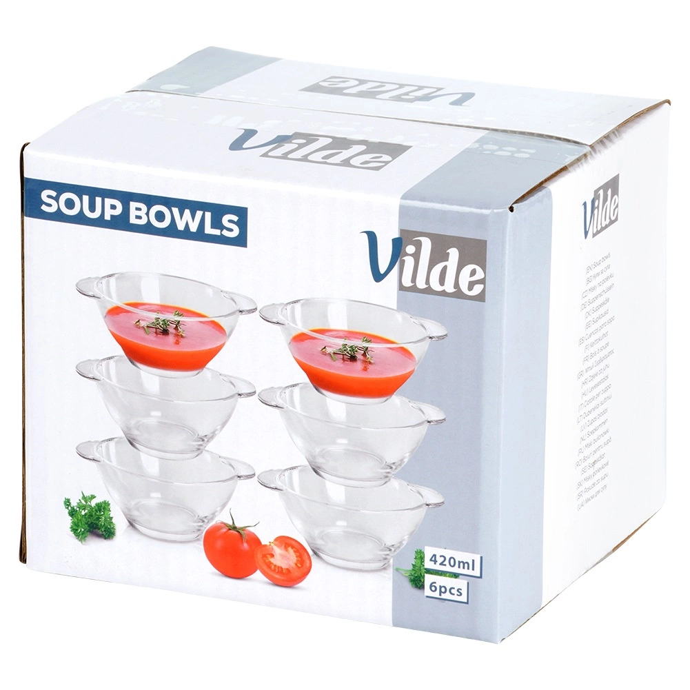 De set glazen soepkommen met een inhoud van 420 ml is een uitstekende keuze voor dagelijks tafelen en feestelijke gelegenheden. Het heldere glas benadrukt de kleuren en structuur van je gerechten, waardoor soepen, crèmes en desserts altijd verleidelijk ogen. Dankzij de klassieke vorm zijn de kommen makkelijk te combineren met elk servies.