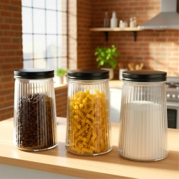 Transparant geribbeld glas verenigt stijl en functionaliteit – je ziet de inhoud in één oogopslag en de pot ligt prettig in de hand.