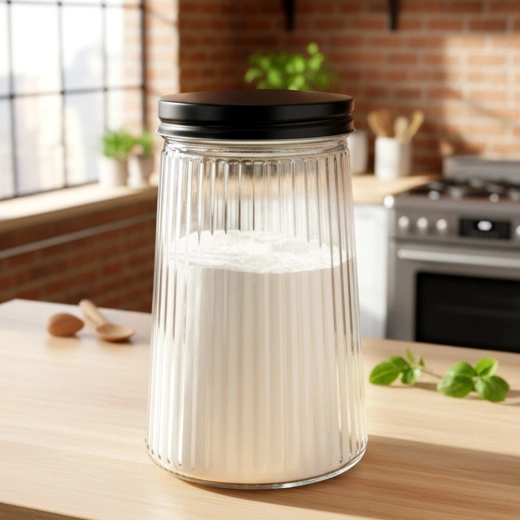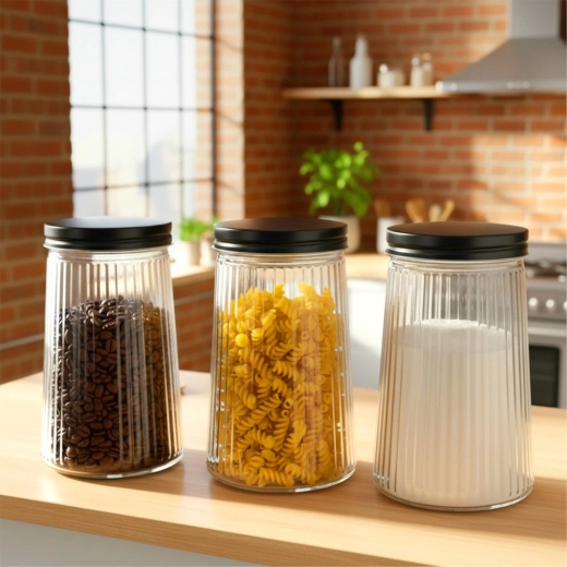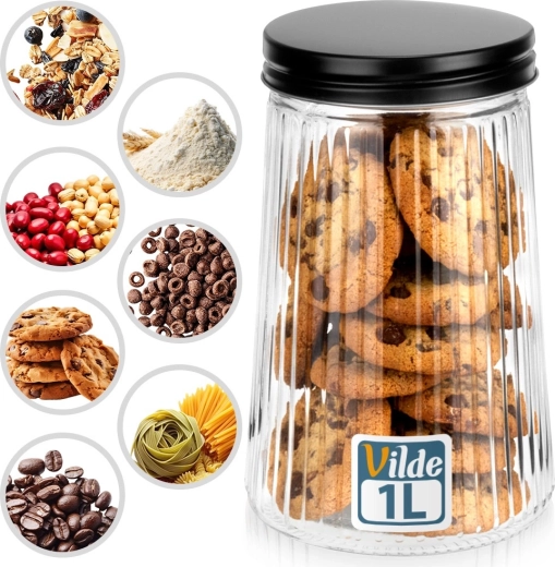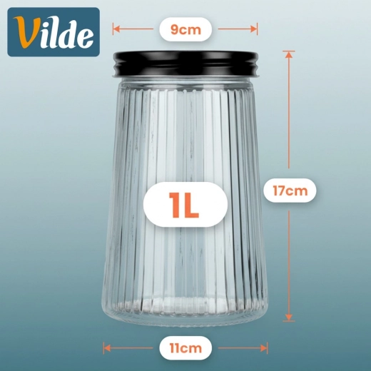 Praktische glazen pot met een inhoud van 1 liter en een schroefbaar metalen deksel houdt je etenswaren langer vers en mooi geordend. Gemaakt van duurzaam borosilicaatglas met een elegant geribbeld design, waardoor je de inhoud en hoeveelheid eenvoudig kunt controleren. Ideaal voor koffie, pasta, suiker, noten en andere droge ingrediënten.