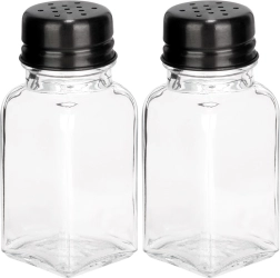 Praktische set van twee kruidenstrooiers – zoutstrooier en peperstrooier – van helder, dik glas met zwarte metalen deksels. Elk potje heeft een inhoud van 80 ml en afmetingen van 4 × 4 × 9,5 cm. Dankzij de geperforeerde doppen doseer je kruiden makkelijk en nauwkeurig, behoud je de versheid en het aroma en heb je je kruiden altijd bij de hand, zowel thuis als in de horeca.