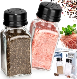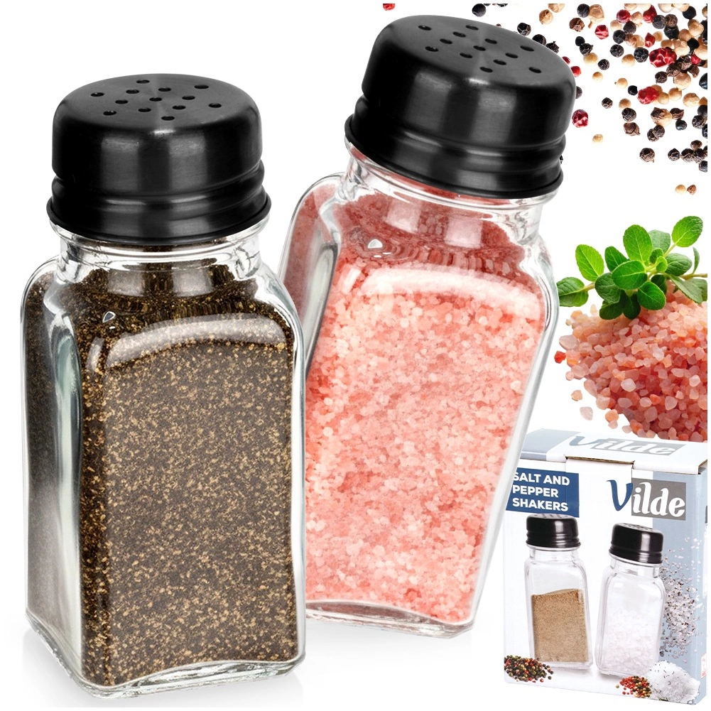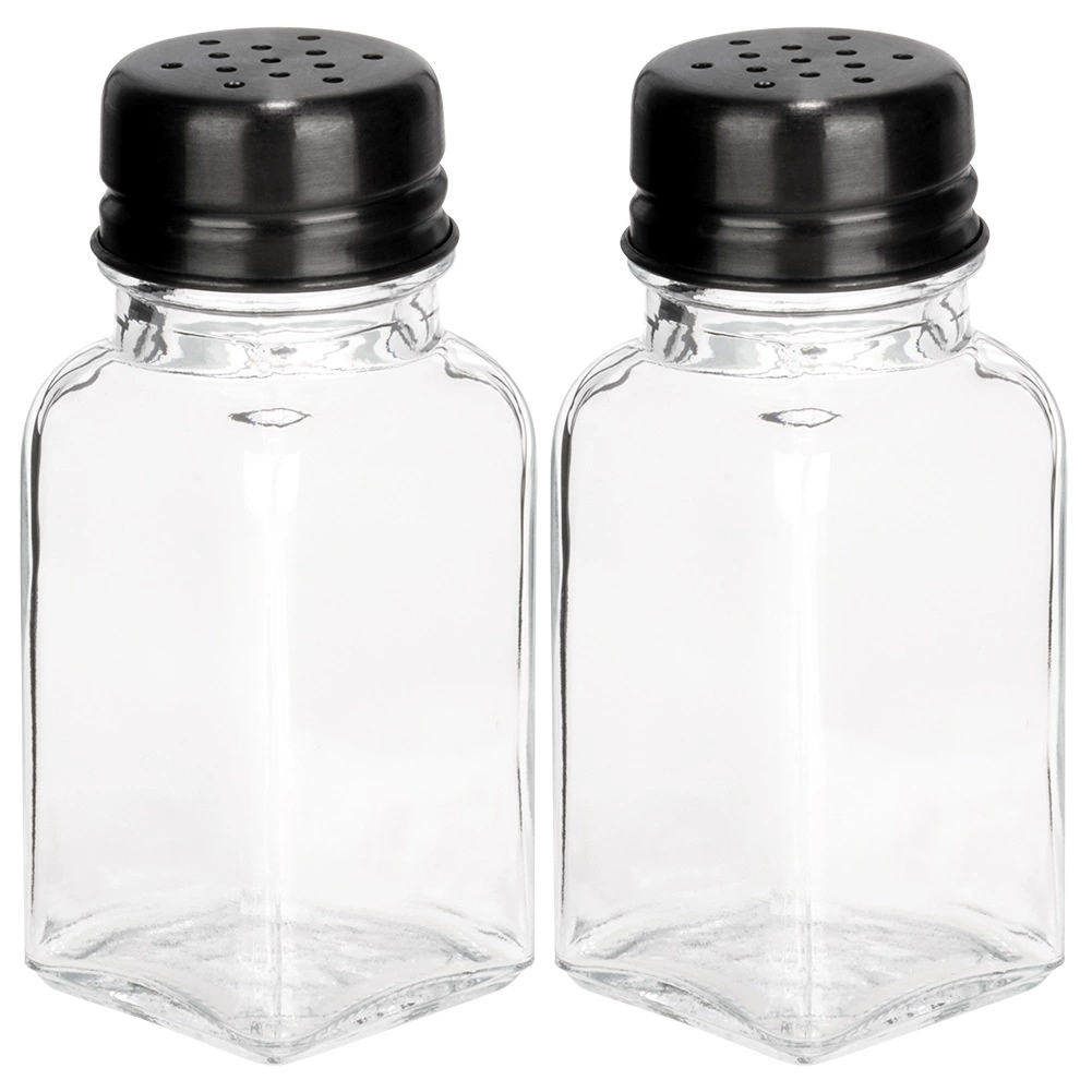 De set van twee elegante kruidenstrooiers van duurzaam helder glas met zwarte metalen deksels is ideaal voor dagelijks gebruik. De transparante body maakt directe controle van de inhoud mogelijk, terwijl het geperforeerde deksel zorgt voor gelijkmatige en gecontroleerde dosering van zout, peper en andere droge kruiden.